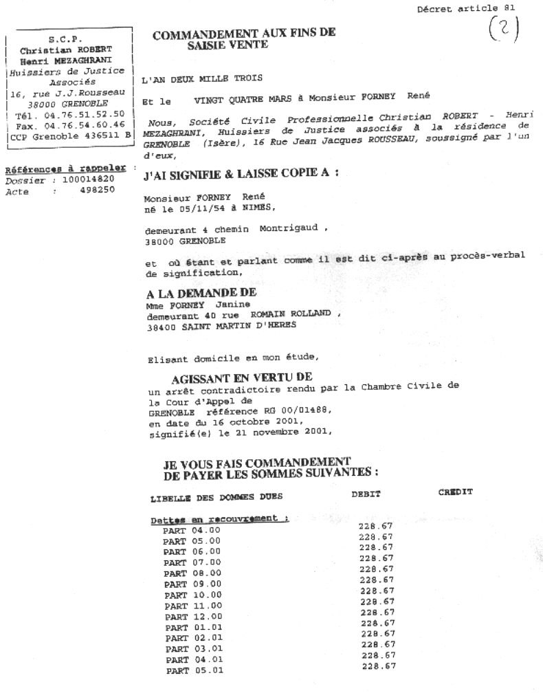 Accueil Inscription de faux 2008 Voir la requête en nullité contre l'huissier Christian ROBERT qui a utilisé illégalement l'associé de l'amant de l'épouse pour le concours de la force publique contre M FORNEY. |