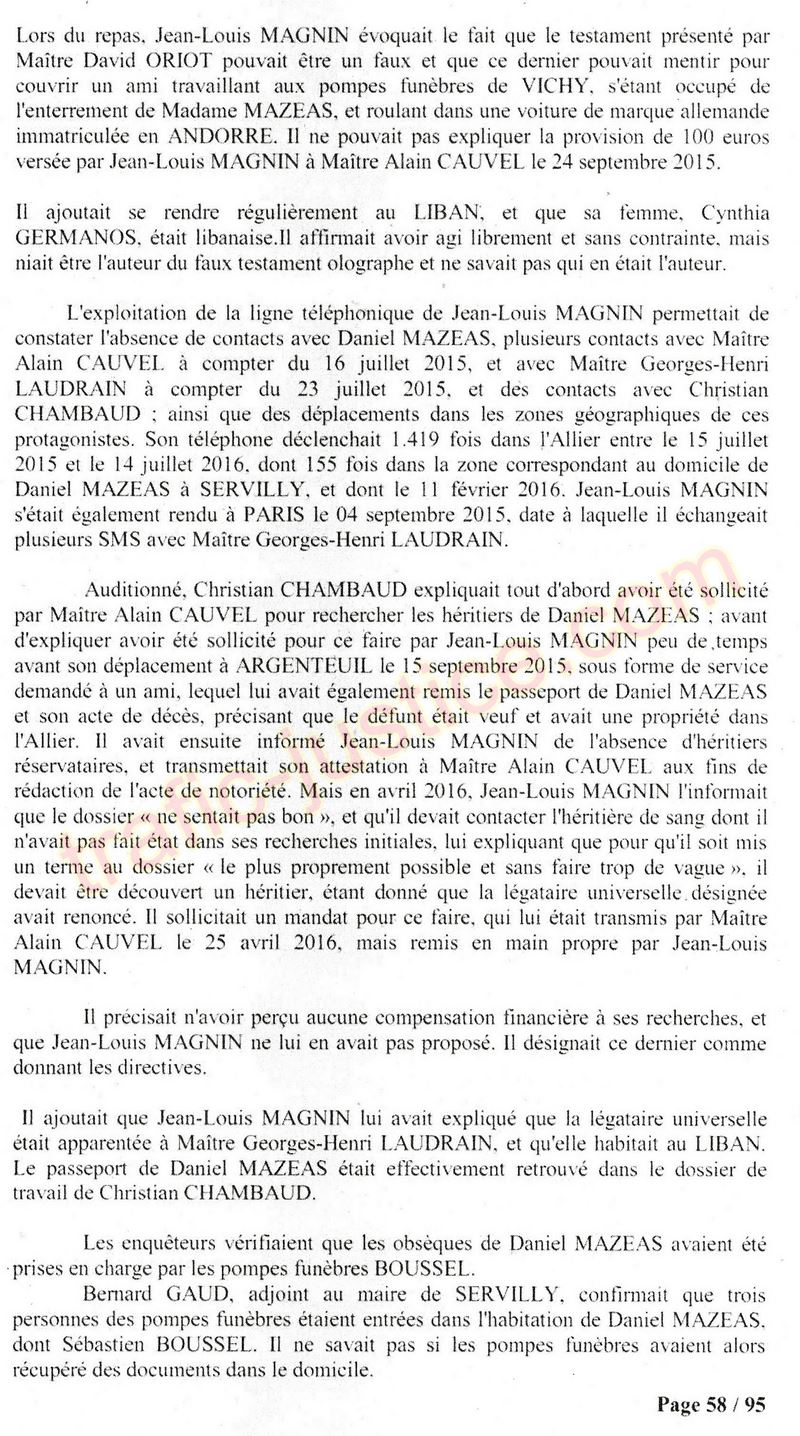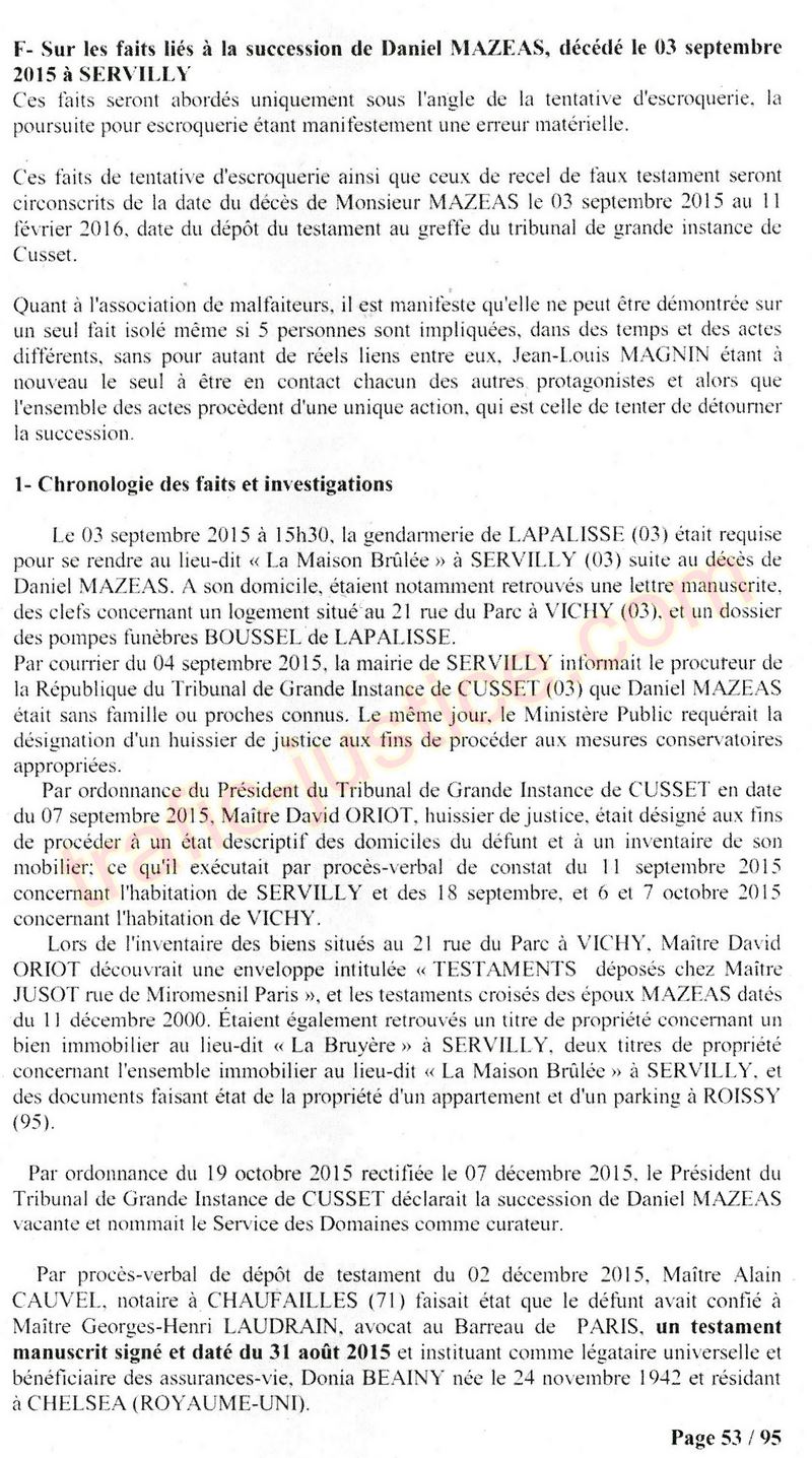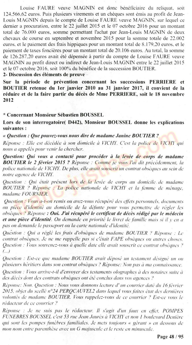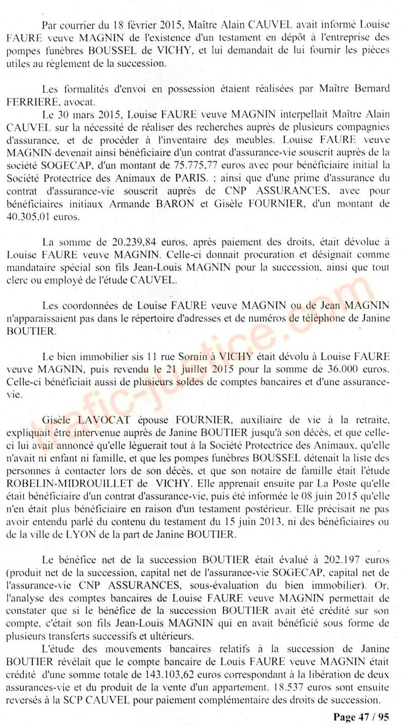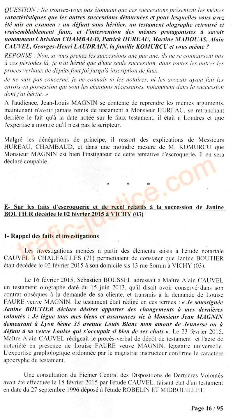 A Cusset (banlieue de Vichy) au lieu de les juger pour crimes de faux pour les détournements avec faux testaments, ils passent en correctionelle avec une quasi impunité. Des prescriptions des spoliés en découlent ! Alors que le notaire MAGNIN est un récidiviste avec un complice actif. (8 ans pour juger cette affaire ! Pourquoi pas après leur mort ?