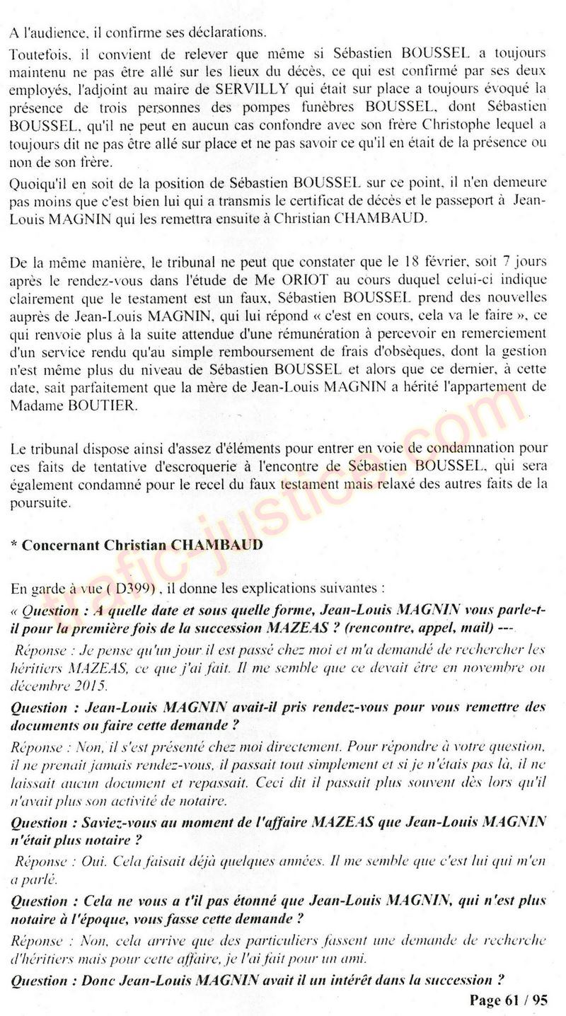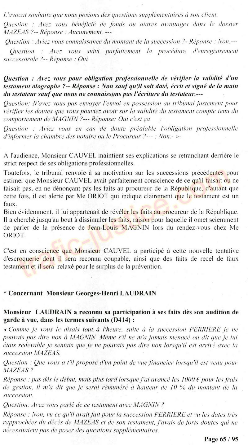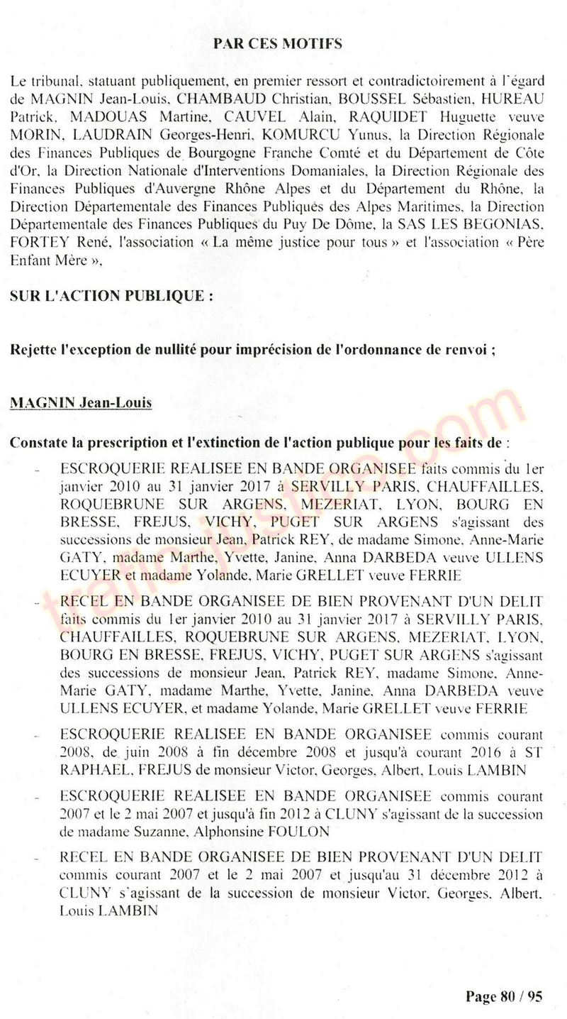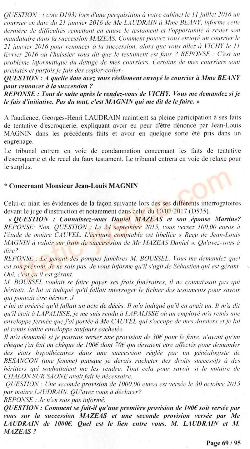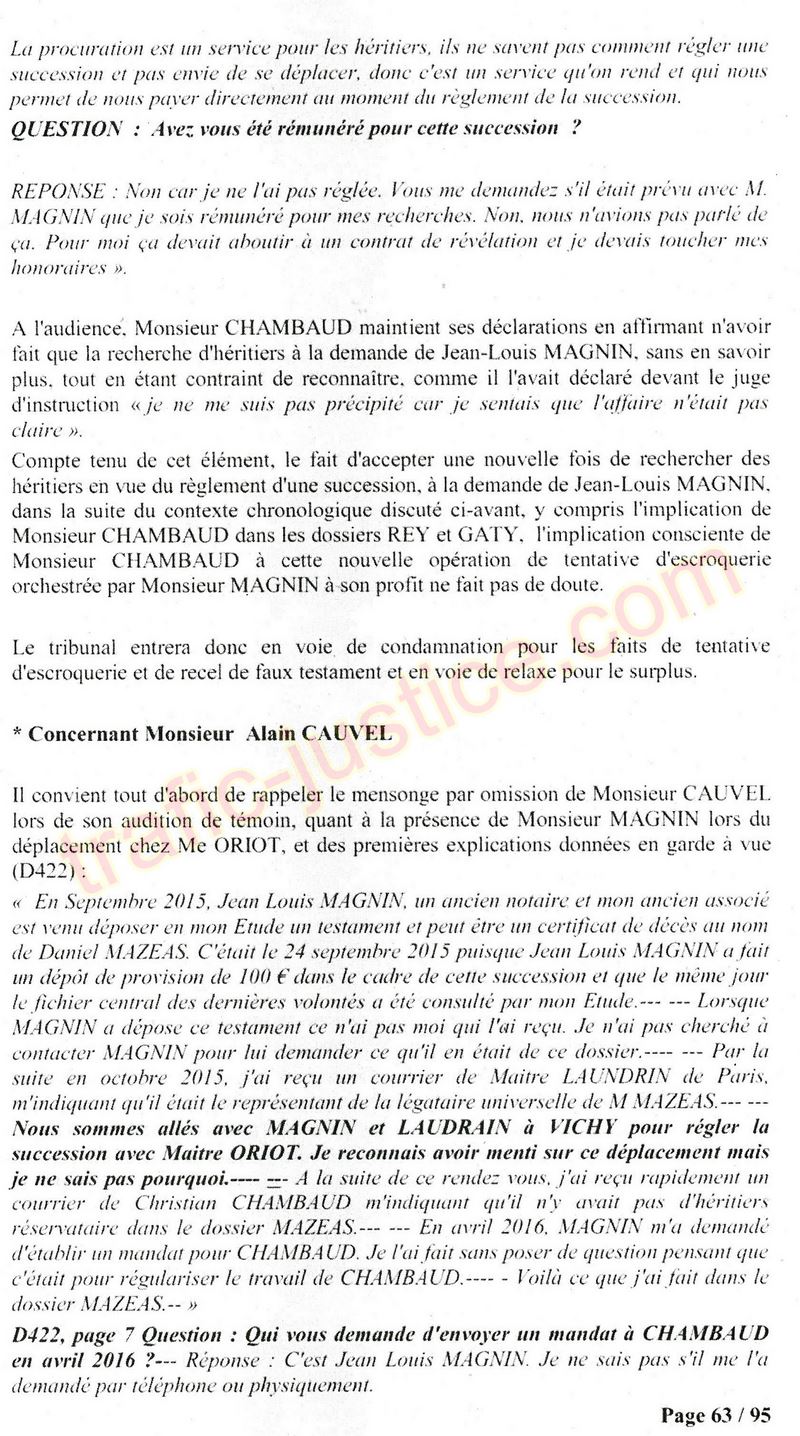 A Cusset (banlieue de Vichy) au lieu de les juger pour crimes de faux pour les détournements avec faux testaments, ils passent en correctionelle avec une quasi impunité. Des prescriptions des spoliés en découlent ! Alors que le notaire MAGNIN est un récidiviste avec un complice actif. (8 ans pour juger cette affaire ! Pourquoi pas après leur mort ?
