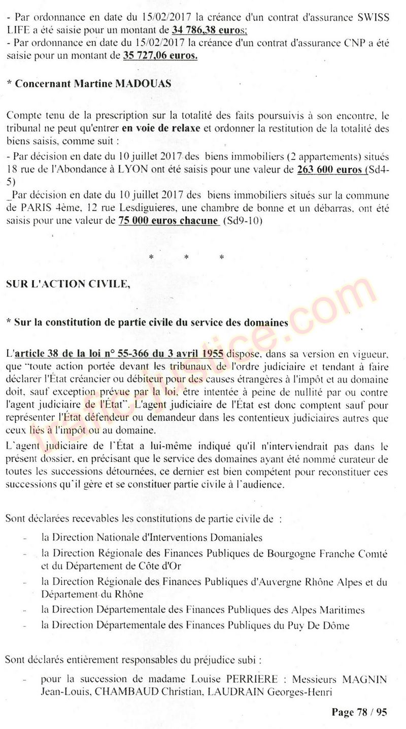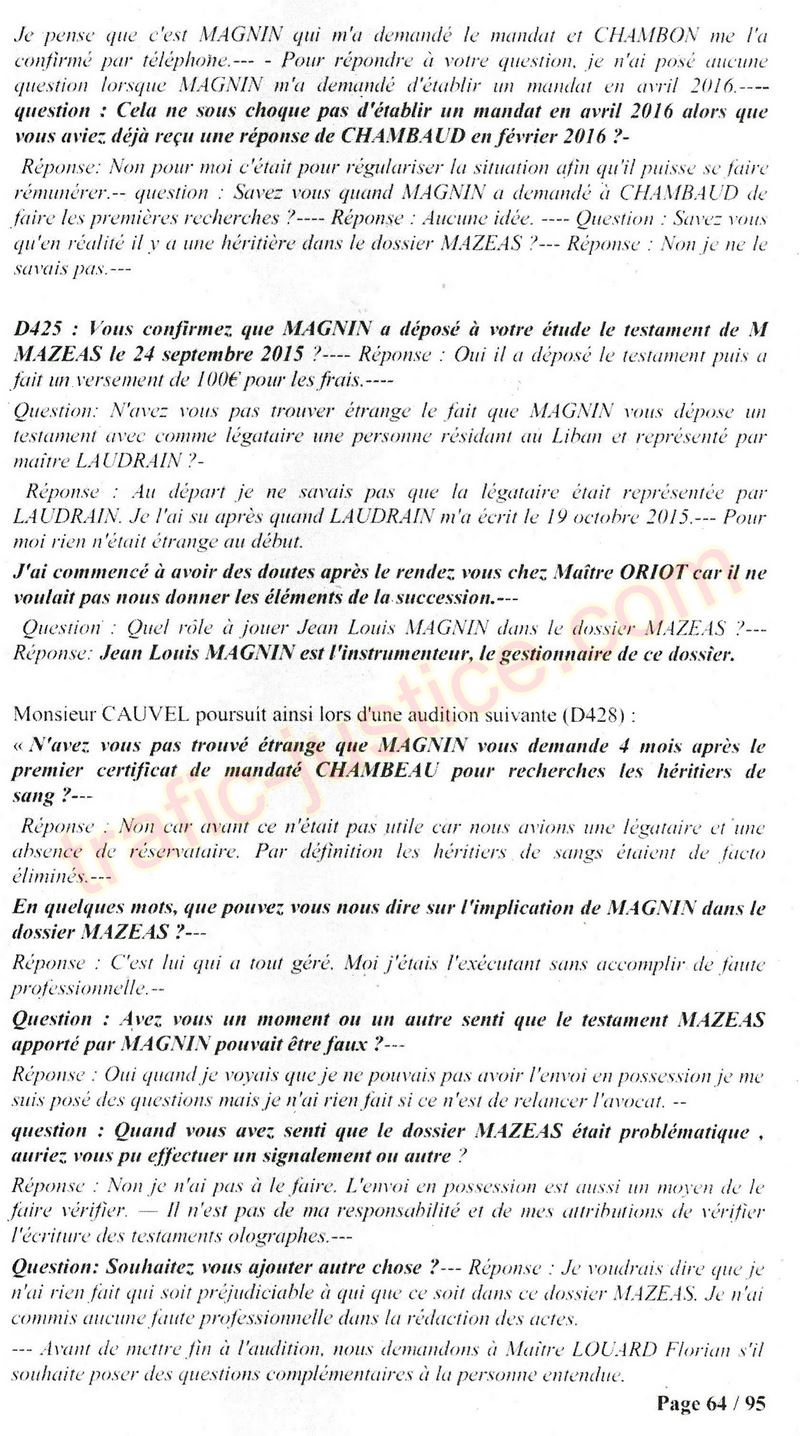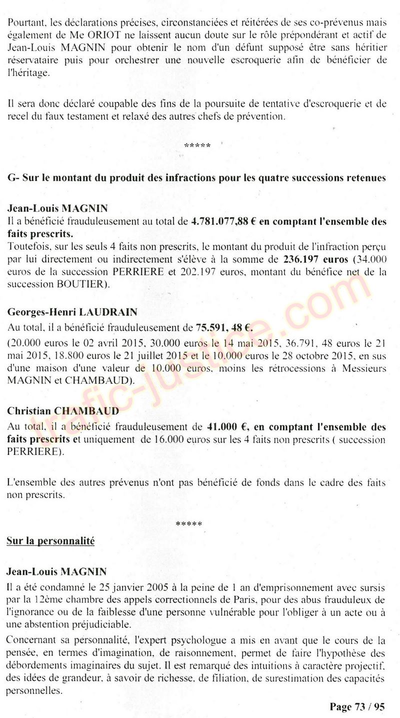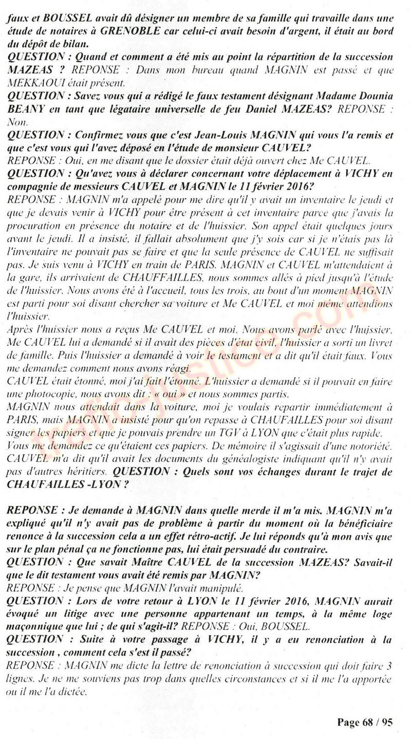 A Cusset (banlieue de Vichy) au lieu de les juger pour crimes de faux pour les détournements avec faux testaments, ils passent en correctionelle avec une quasi impunité. Des prescriptions des spoliés en découlent ! Alors que le notaire MAGNIN est un récidiviste avec un complice actif. (8 ans pour juger cette affaire ! Pourquoi pas après leur mort ?