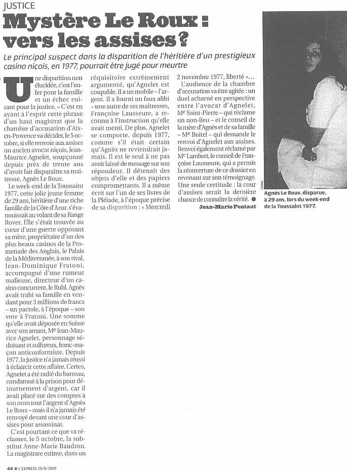 principal suspect ... disparition de l'héritière ... casino niçois, en 1997 ... jugé pour meurtre ... haut magistrat que la chambre d'accusation d'AIX en Provence ... avocat niçois, Jean-Maurice Agnelet, soupçonné depuis près de trente ans ... disparaître sa maîtresse, Agnès Le Roux ...