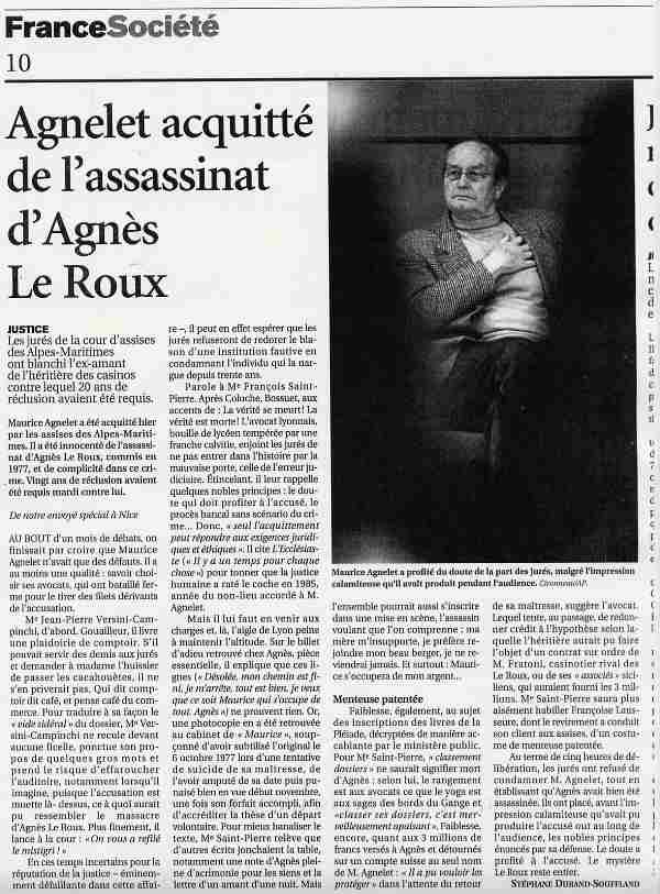 l'objet d'un contrat sur ordre de M. Fratoni, casinotier rival des Le Roux, ou de ses " associés " siciliens, qui auraient fourni les 3 millions. Me Saint-Pierre saura plus aisément habiller Françoise Lausseure, dont le revirement a conduit son client aux assises, d'un costume de menteuse patentée. Au terme de cinq heures de délibération, les jurés ont refusé de condamner M. Agnelet, tout en établissant qu'Agnès avait bien été assassinée. Ils ont placé, avant l'impression calamiteuse qu'avait pu produire l'accusé out au long de l'audience, les nobles principes énoncés par sa défense. Le doute a profité à l'accusé. Le mystère Le Roux reste entier. STÉPHANE DURAND-SOUFFLAND |