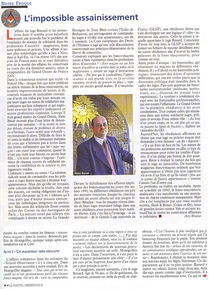 L'affaire du juge Renard et les protections dont il semble avoir bénéficié posent une nouvelle fois le problème de l'existence de réseaux de solidarité dans les professions d'autorité - magistrats, mais aussi policiers et avocats. Une affaire d'autant plus symbolique qu'elle a lieu à Nice, dans le Sud-Est, où l'on trouve 10% des maçons de France mais où se sont déroulées plus de la moitié des affaires les concernant au cours des dix dernières années, selon la comptabilité du Grand Orient de France (GO). Dans le volumineux courrier que reçoit . le Nouvel Obs ? Chaque fois que nous publions un article traitant de la franc-maçonnerie, un nombre impressionnant de lettres et de courriels émanent de justiciables convaincus d'avoir été trahis par leurs avocats ou par leurs juges en raison de solidarités maçonniques qui leur échappent et qui englobent souvent les experts judiciaires et autres professions connexes . Lorsqu'il était grand maître du Grand Orient, Alain Bauer recevait plus d'une lettre de dénonciation par semaine. . Si la moitié ne tient pas debout, traitant de problèmes de divorce ou d'héritage, l'autre moitié nous interpelle ., reconnaissait-il alors. Difficile de faire le tri entre la réalité et les fantasmes malsains de ceux qui n'hésitent pas à écrire dans des lettres enflammées que les . juges maçons . ont ruiné leur commerce, quand ils n'ont pas violé leur femme ou perdu leur fille... Un seul constat s'impose : l'existence de réseaux secrets de solidarité entame la crédibilité de la justice et des jugements rendus. Comment y mettre un terme ? La solution radicale serait de contraindre tous les policiers et juges francs-maçons à déclarer leur appartenance . Mais dés qu'elle est évoquée, cette solution déchaîne la foudre. Aux yeux des maçons, cet outing obligatoire est d'autant plus choquant qu'il ne s'adresse qu'à eux, alors que d'autres réseaux existent : ceux des catholiques intégristes en particulier. Mais aussi des solidarités floues comme celles des Corses ou des Auvergnats de Paris... La mesure serait par ailleurs très compliquée à mettre en oeuvre. |
