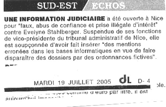 | Source : le Dauphiné Libéré du 19 juillet 2005 "... pour faux, abus de confiance et prise illégale d'intérêt contre Evelyne Stahlberger. Suspendue de ses fonctions de vice-présidente du tribunal administratif de Nice ... mentions erronée dans les bases informatiques en vue de faire disparaitre des dossiers par des ordonnances fictives " |