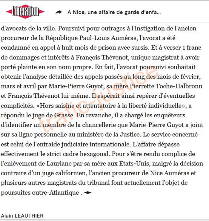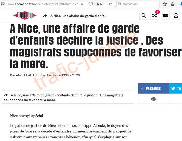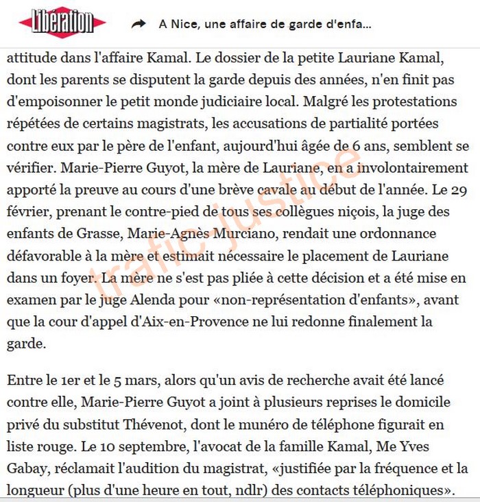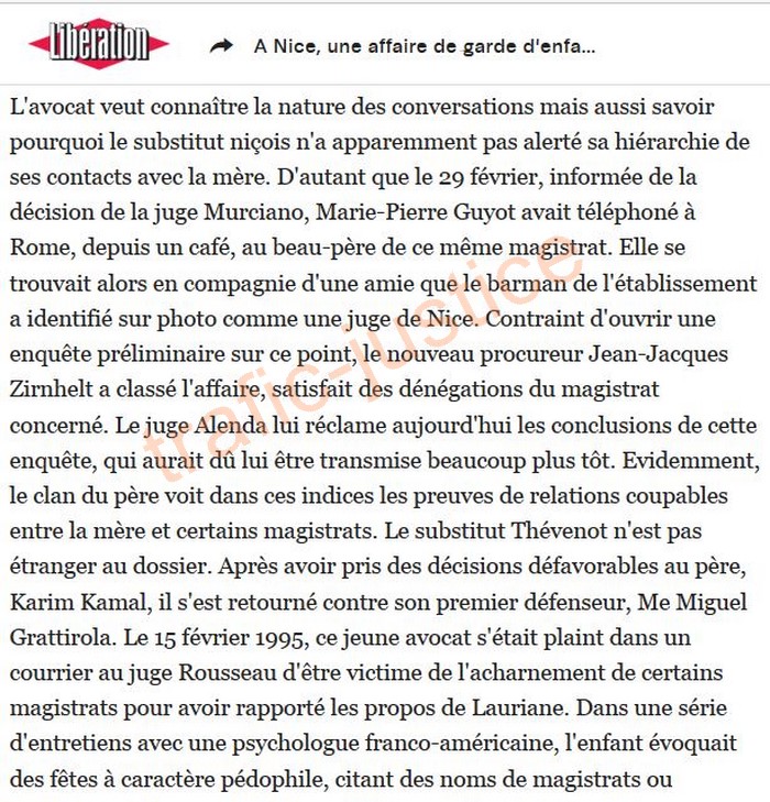 http://www.liberation.fr/france-archive/1996/10/04/a-nice-une-affaire-de-garde-d-enfants-dechire-la-justice-des-magistrats-soupconnes-de-favoriser-la-m_184959 A Nice, une affaire de garde d'enfants déchire la justice. Des magistrats soupçonnés de favoriser la mère. Par Alain LEAUTHIER — 4 octobre 1996 à 23:29 Nice envoyé spécial Le palais de justice de Nice est en émoi: Philippe Alenda, le doyen des juges de Grasse, a décidé d'entendre un membre éminent du parquet, le substitut aux mineurs François Thévenot, afin qu'il s'explique sur son attitude dans l'affaire Kamal. Le dossier de la petite Lauriane Kamal, dont les parents se disputent la garde depuis des années, n'en finit pas d'empoisonner le petit monde judiciaire local. Malgré les protestations répétées de certains magistrats, les accusations de partialité portées contre eux par le père de l'enfant, aujourd'hui âgée de 6 ans, semblent se vérifier. Marie-Pierre Guyot, la mère de Lauriane, en a involontairement apporté la preuve au cours d'une brève cavale au début de l'année. Le 29 février, prenant le contre-pied de tous ses collègues niçois, la juge des enfants de Grasse, Marie-Agnès Murciano, rendait une ordonnance défavorable à la mère et estimait nécessaire le placement de Lauriane dans un foyer. La mère ne s'est pas pliée à cette décision et a été mise en examen par le juge Alenda pour «non-représentation d'enfants», avant que la cour d'appel d'Aix-en-Provence ne lui redonne finalement la garde. Entre le 1er et le 5 mars, alors qu'un avis de recherche avait été lancé contre elle, Marie-Pierre Guyot a joint à plusieurs reprises le domicile privé du substitut Thévenot, dont le munéro de téléphone figurait en liste rouge. Le 10 septembre, l'avocat de la famille Kamal, Me Yves Gabay, réclamait l'audition du magistrat, «justifiée par la fréquence et la longueur (plus d'une heure en tout, ndlr) des contacts téléphoniques». L'avocat veut connaître la nature des conversations mais aussi savoir pourquoi le substitut niçois n'a apparemment pas alerté sa hiérarchie de ses contacts avec la mère. D'autant que le 29 février, informée de la décision de la juge Murciano, Marie-Pierre Guyot avait téléphoné à Rome, depuis un café, au beau-père de ce même magistrat. Elle se trouvait alors en compagnie d'une amie que le barman de l'établissement a identifié sur photo comme une juge de Nice. Contraint d'ouvrir une enquête préliminaire sur ce point, le nouveau procureur Jean-Jacques Zirnhelt a classé l'affaire, satisfait des dénégations du magistrat concerné. Le juge Alenda lui réclame aujourd'hui les conclusions de cette enquête, qui aurait dû lui être transmise beaucoup plus tôt. Evidemment, le clan du père voit dans ces indices les preuves de relations coupables entre la mère et certains magistrats. Le substitut Thévenot n'est pas étranger au dossier. Après avoir pris des décisions défavorables au père, Karim Kamal, il s'est retourné contre son premier défenseur, Me Miguel Grattirola. Le 15 février 1995, ce jeune avocat s'était plaint dans un courrier au juge Rousseau d'être victime de l'acharnement de certains magistrats pour avoir rapporté les propos de Lauriane. Dans une série d'entretiens avec une psychologue franco-américaine, l'enfant évoquait des fêtes à caractère pédophile, citant des noms de magistrats ou d'avocats de la ville. Poursuivi pour outrages à l'instigation de l'ancien procureur de la République Paul-Louis Auméras, l'avocat a été condamné en appel à huit mois de prison avec sursis. Et à verser 1 franc de dommages et intérêts à François Thévenot, unique magistrat à avoir porté plainte en son nom propre. En fait, l'avocat poursuivi souhaitait obtenir l'analyse détaillée des appels passés au long des mois de février, mars et avril par Marie-Pierre Guyot, sa mère Pierrette Toche-Halbronn et François Thévenot lui-même. Il espérait ainsi repérer d'éventuelles complicités. «Hors saisine et attentatoire à la liberté individuelle», a répondu le juge de Grasse. En revanche, il a chargé les enquêteurs d'identifier un membre de la chancellerie que Marie-Pierre Guyot a joint sur sa ligne personnelle au ministère de la Justice. Le service concerné est celui de l'entraide judiciaire internationale. L'affaire dépasse effectivement le strict cadre hexagonal. Pour s'être rendu complice de l'enlèvement de Lauriane par sa mère aux Etats-Unis, malgré la décision contraire d'un juge californien, l'ancien procureur de Nice Auméras et plusieurs autres magistrats du tribunal font actuellement l'objet de poursuites outre-Atlantique . |