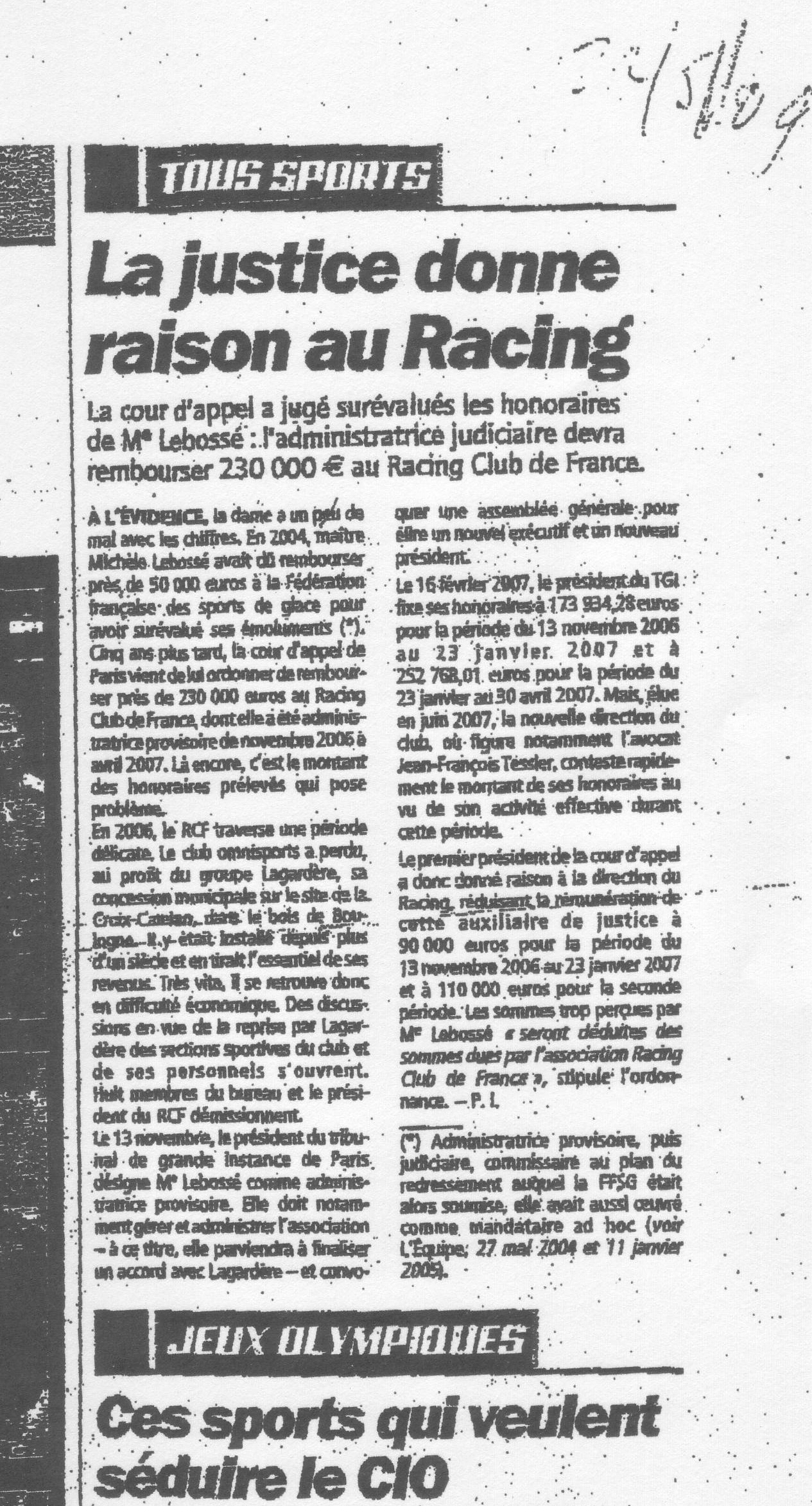 À l'ÉVIDENCE, la dame à un peu de mal avec les chiffres. En 2004, maître Michèle Lebossé avait dû rembourser près de 50 000 euros à la Fédération française des sports de glace pour avoir surévalué ses émoluments (*) Cinq ans plus tard, la cour d'appel de Paris vient de lui ordonner de rembourser près de 230 000 euros au Racing Club de France, dont elle a été administratrice provisoire de novembre 2006 à avril 2007. La encore, c'est le montant des honoraires prélevés qui pose problème. En 2006, le RCF traverse une période délicate, le club omnisports a perdu, au profit du groupe Lagardaire, sa concession municipale sur le site de la Crois Catelan dans le bois de Boulogne. Il y était installé depuis plus d'un siècle et en tirait l'essentiel de ses revenus. Très vite, il se retrouve donc en difficulté économique. Des discussions en vue de la reprise par Lagardère des sections Sportives du club et de ses personnels s'ouvrent. Huit membres du bureau et le président du RCF démissionnent.