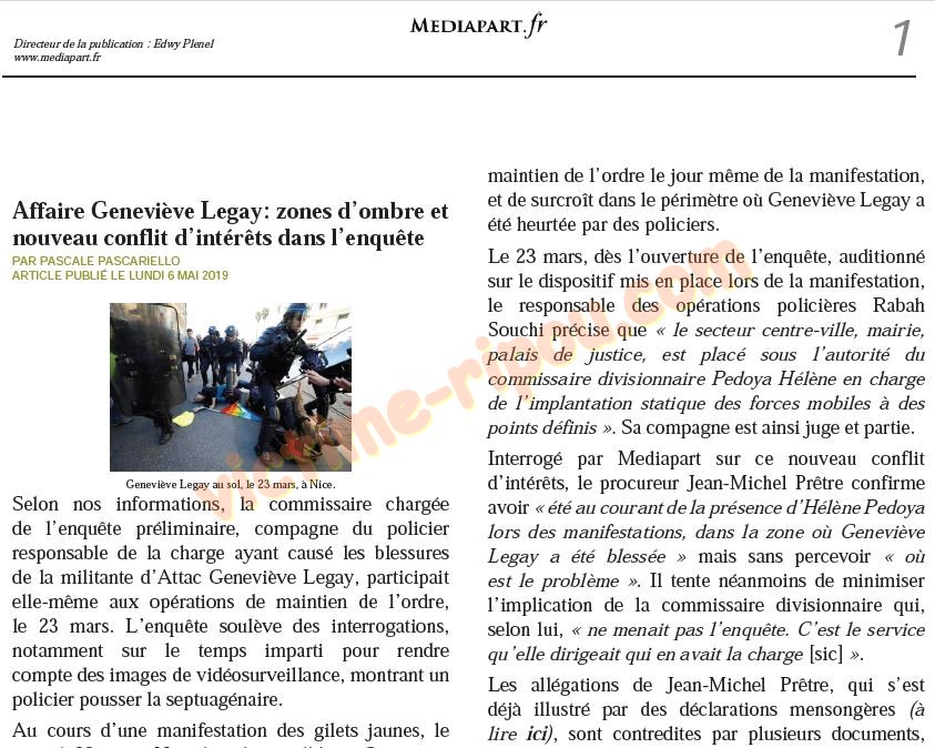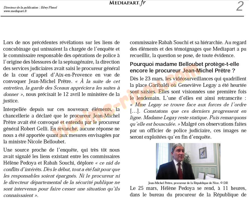 Interrogé par Mediapart sur ce nouveau conflit d'intérêts, le procureur Jean-Michel Prêtre confirme avoir « été au courant de la présence d Hélène Pedoya lors des manifestations, dans la zone où Geneviève Legay a été blessée » mais sans percevoir « où est le problème ». Il tente néanmoins de minimiser l'implication de la commissaire divisionnaire qui, selon lui, « ne menait pas l'enquête. C'est le service qu 'elle dirigeait qui en avait la charge [sic] ».