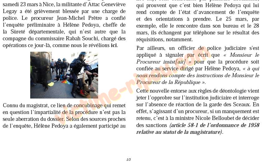 samedi 23 mars à Nice, la militante d'Attac Geneviève Legay a été grièvement blessée par une charge de police. Le procureur Jean-Michel Prêtre a confié l'enquête préliminaire à Hélène Pedoya, cheffe de la Sûreté départementale, qui n'est autre que la compagne du commissaire Rabah Souchi, chargé des opérations ce jour-là, comme nous le révélions ici.