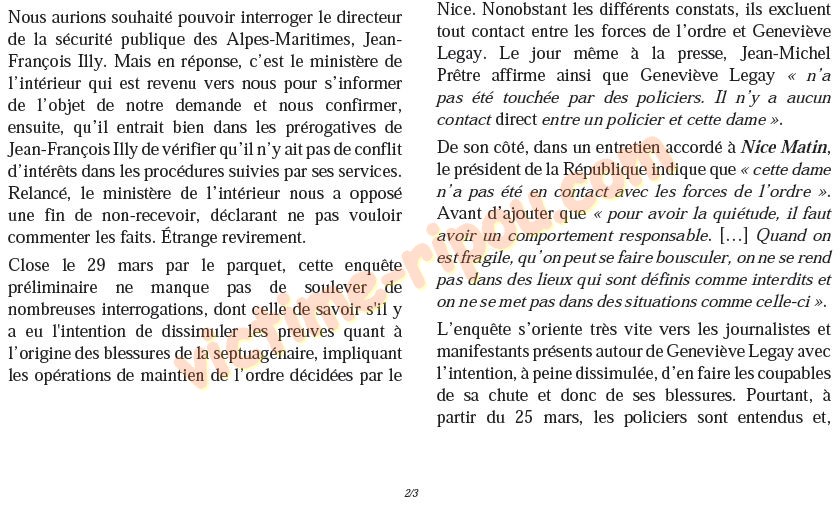 L'enquête s'oriente très vite vers les journalistes et manifestants présents autour de Geneviève Legay avec l'intention, à peine dissimulée, d'en faire les coupables de sa chute et donc de ses blessures. Pourtant, à partir du 25 mars, les policiers sont entendus et, |