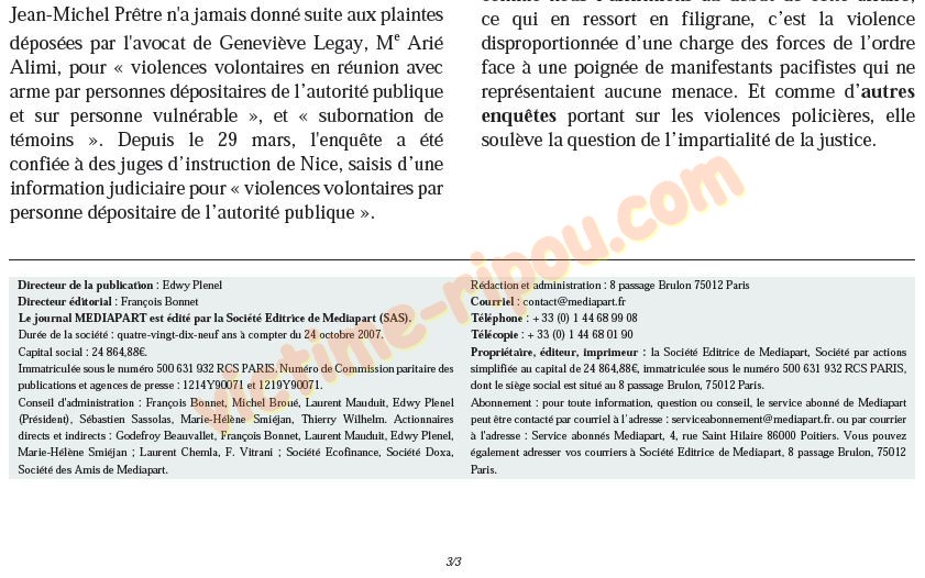 Propriétaire, éditeur. Imprimeur : h Société Editrice de Mediapart. Société par actions simplifiée au capital de 24 864.88C. immatriculée sous le numéro 500 631 932 RCS PARIS, dont le siège social est situé au 8 passage Brulon. 75012 Paris.