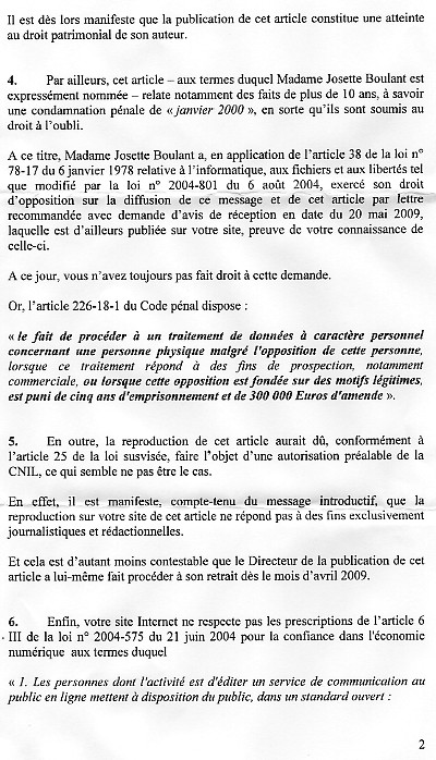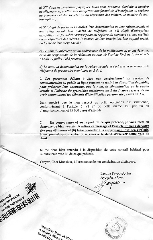 Première réponse de l'ex huissière suite à cette publication (voir) Suite par son avocat Laeticia FAYON-BOULAY ci-dessous - Puis assignation à Paris pour mon "délit de presse" en oubliant les lois sur la presse : Voir