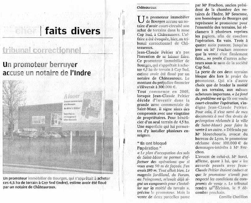 par Me Fruchon, ancien président de la chambre des notaires de l'Indre. Me Souesme, son homologue de Bourges qui représente le promoteur pour l'ensemble des terrains, lui réclamera à plusieurs reprises les papiers, afin de conclure l'opération. En vain. Trois à quatre mois passent. Jusqu'au jour où Me Fruchon annonce que la vente s'est finalement faite... au profit d'autres acheteurs sous le nom de la société Cap Sud. La perte de ces deux terrains bloque dès lors le projet du promoteur. Qui n'a d'autre choix que de brader la moitié de ses terrains, aux mêmes acheteurs importuns. « Le fond du problème est qu'ils ont voulu court-circuiter l'opération. s'indigne Jean-Claude Peltier. Pour cela, il s'est servi de mes documents à moi (les droits de préemption réclamés à la ville de Saint-Maur) pour faire la vente à un autre. » Défendu par Me Moutchouris, avocat du barreau de Lyon, le promoteur réclame donc 100.000 € de dommages-intérêts à Me Fruchon. L'avocat de celui-ci, Me Sorel, affirme, quant à lui, que « les accords passés par Jean-Claude Peltier étaient caducs et que le promoteur n'avait pas respecté les conditions du compromis de vente » Le tribunal rendra sa décision le 9 décembre prochain. Camille Chatillon |