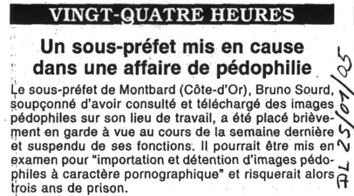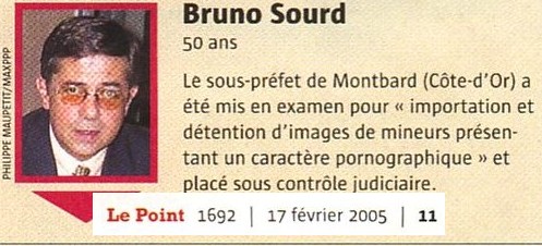 " Bruno SOURD, 50 ans, Le sous-préfet de Montbard (Côte-d'Or) a été mis en examen pour " importation et détention, d'images de mineurs présentant un caractère pornographique " et placé sous contrôle judiciaire. "