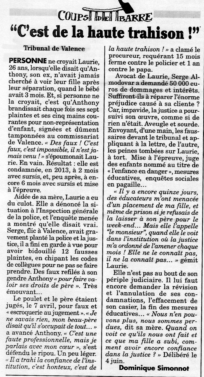 Tribunal de Valence PERSONNE ne croyait Laurie, 26 ans, lorsqu'elle disait qu'Anthony, son ex, n'avait jamais cherché à voir leur fille après leur séparation, quand le bébé avait 3 mois. Et, si personne ne la croyait, c'est qu'Anthony brandissait chaque fois ses sept plaintes et ses cinq mains courantes pour non-représentation d'enfant, signées et dûment tamponnées au commissariat de Valence. « Des faux ! C'est faux, c'est impossible, il n'est jamais venu ! » s'époumonait Laurie. En vain. Résultat : elle est condamnée, en 2013, à 2 mois avec sursis, et, peu après, à encore 6 mois avec sursis et mise à l'épreuve. Aidée de sa mère, Laurie a eu du culot. Elle a dénoncé la situation à l'Inspection générale de la police, et l'enquête menée a montré qu'elle disait vrai. Serge, flic à Valence, avait gravement planté la police et la justice, il a fini en garde à vue pour avoir bidouillé 12 fausses plaintes, en chipant les codes de collègues pour ne pas se faire prendre. Des faux refilés à son gendre Anthony « pour faire valoir ses droits de père ». Très émouvant... Le poulet et le père étaient jugés, le 7 avril, pour faux et « escroquerie au jugement ». « Je ne savais rien, mon beau-père disait qu'il s'occupait de tout... » a avancé Anthony. « C'est une faute professionnelle, mais je parlais avec mon cœur », s'est défendu le ripou. Un peu léger. « Il a trahi la confiance de l'institution, c'est honteux, c'est de la haute trahison ! » a clamé le procureur, requérant 15 mois ferme contre le policier et 1 an contre le papa. |