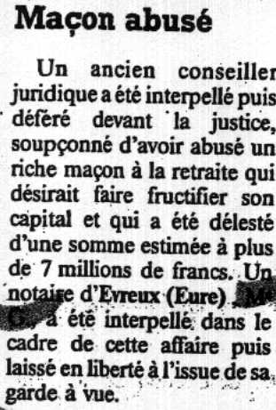 Un ancien conseiller juridique a été interpellé puis déféré devant la justice... délesté d'une somme estimée à plus de 7 millions de francs. Un notaire d'Eyvreux (EURE)...