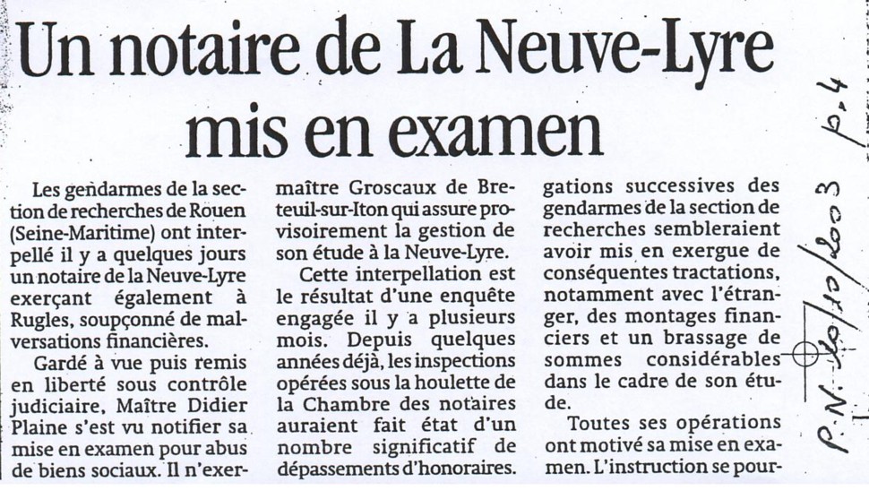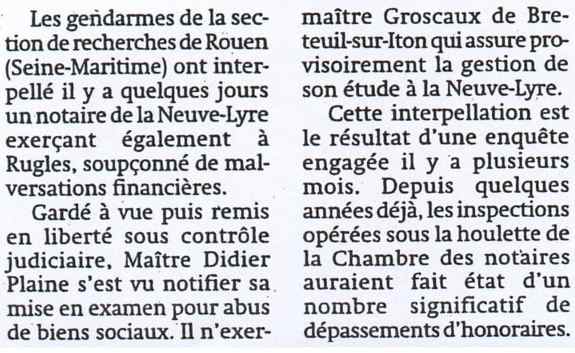 de l'article Autres ... section de recherche de Rouen (Seine-Maritime) ... un notaire de la Neuve-Lyre exerçant également à Rugles, soupçonné de malversations financières... Maître Didier Plaine s'est vu notifier sa mise en examen pour abus de biens sociaux ... Groscaux de Breteuil-sur-Iton ... quelques années déjà, les inspections opérées sous la houlette de la Chambre des notaires... nombre significatif de dépassements d'honoraires... conséquentes tractations notamment avec l'étranger, des montages financiers... Il y a d'autres qui passent entre les mailles de la justice de juges complaisants avec des notables mafieux |