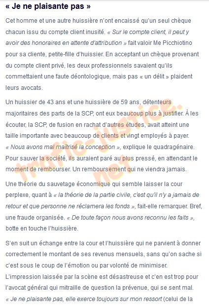 | Ici l'huissier est poursuivi par un confrères, mais quand c'est un client de l'étude qui est pillé il peut attendre très longtemps l'action de la justice | ||||||