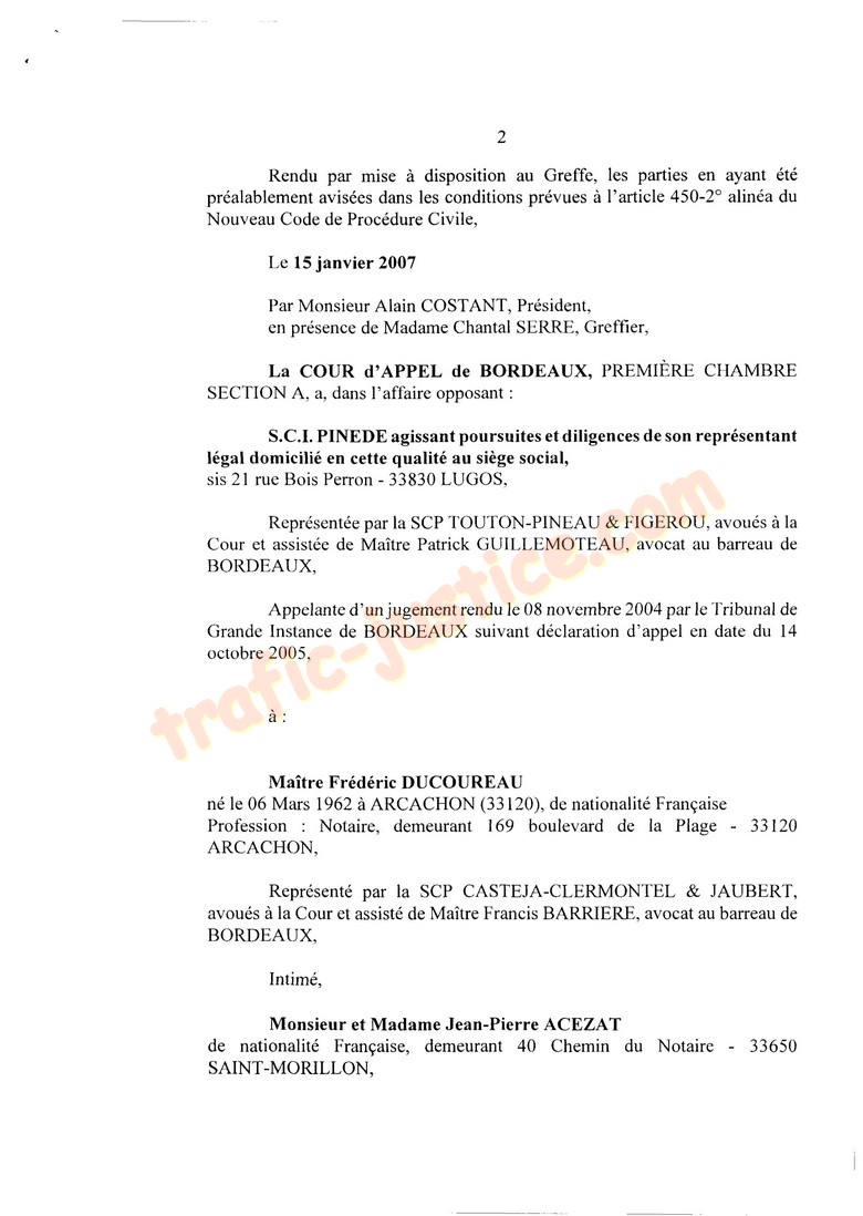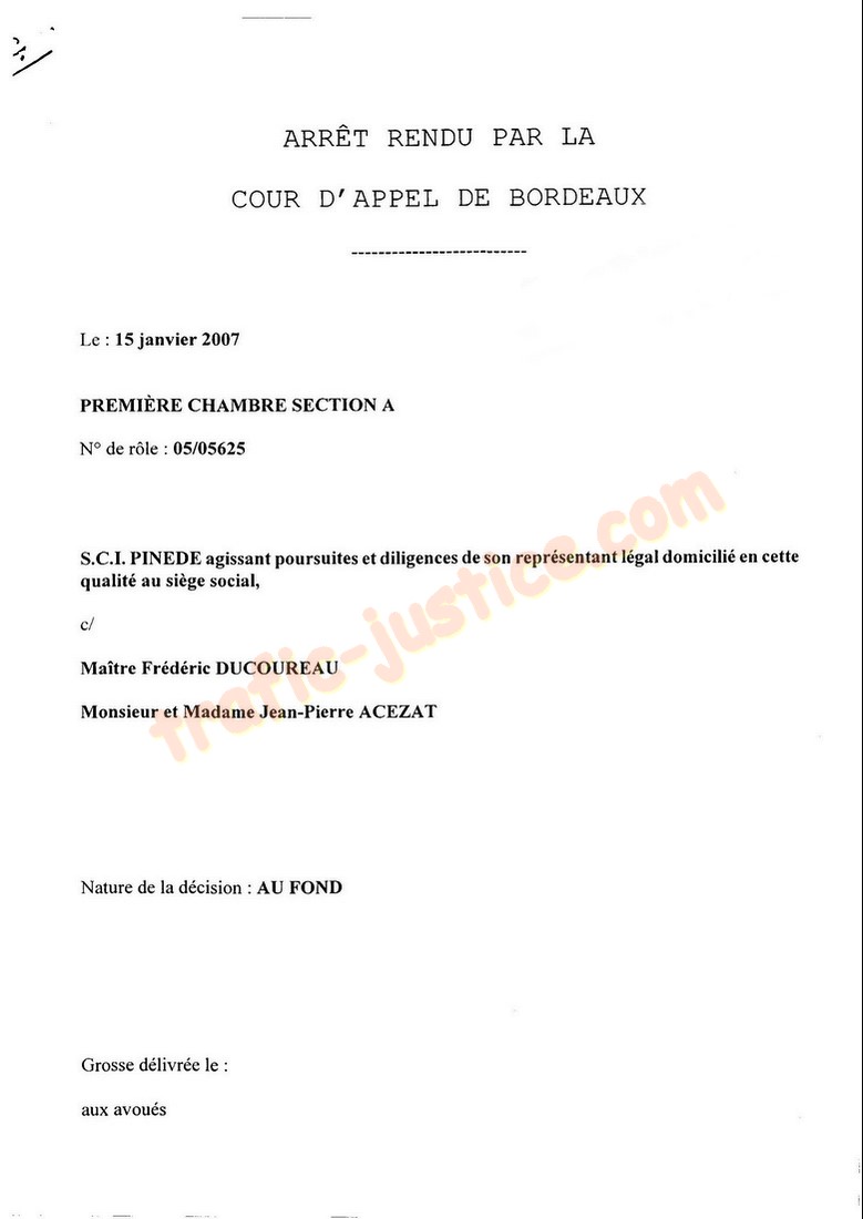 Ducourau à 13 000 euros par la Cour d'appel de Bordeaux, ARRÊT RENDU PAR LA Le : 15 janvier 2007 PREMIÈRE CHAMBRE SECTION A S.C.l. PINEDE agissant poursuites et diligences de son représentant