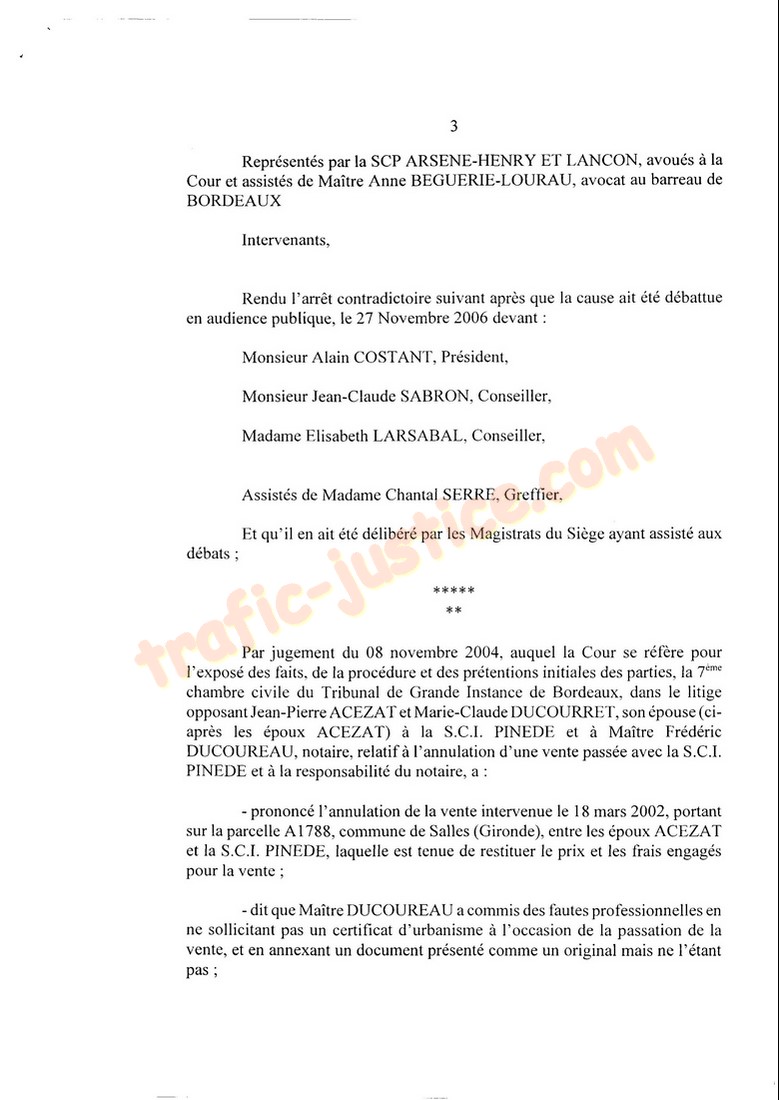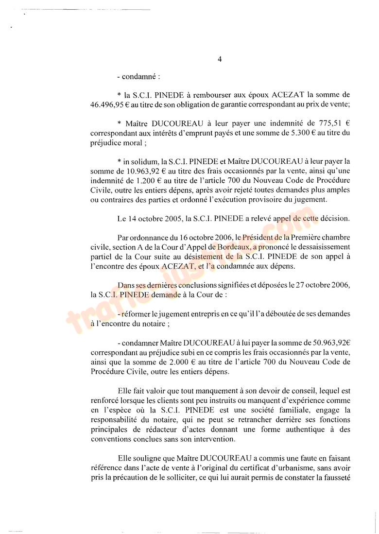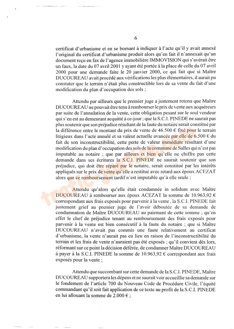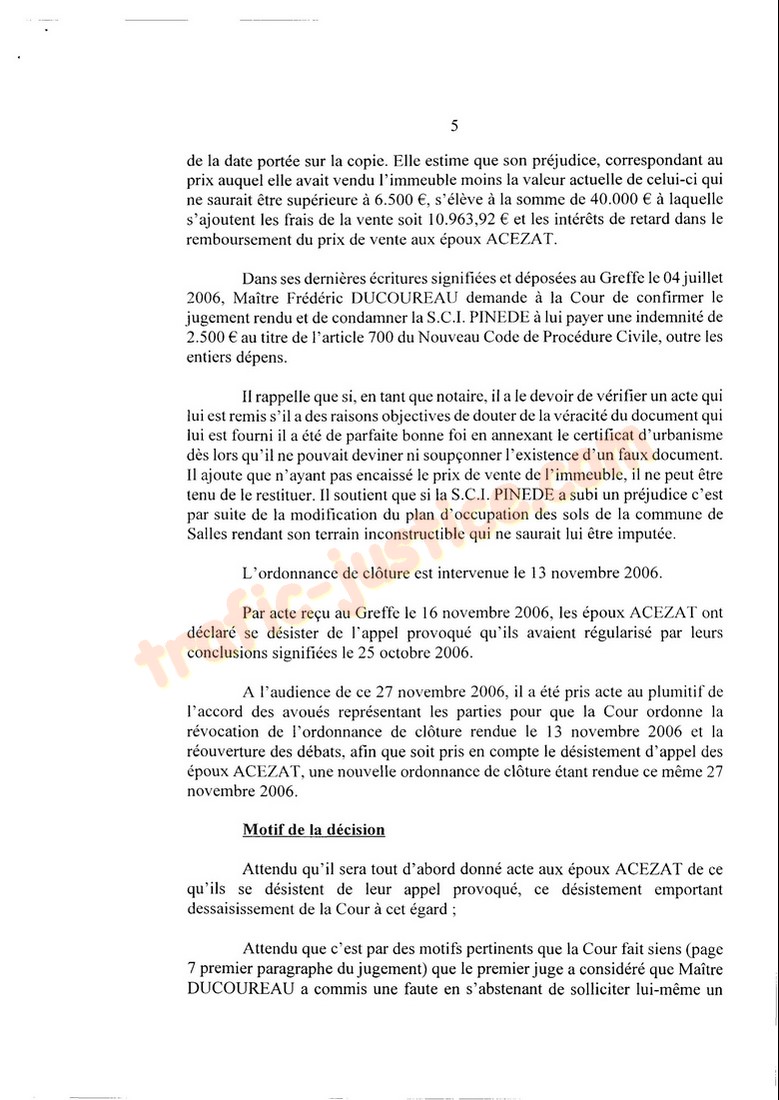 de celui-ci qui Dans ses dernières écritures signifiées et déposées au Greffe le 04 juillet 2006, Maître Frédéric DUCOURAU demande à la Cour de confirmer le jugement rendu et de condamner la S.C.I. PINEDE à lui payer une indemnité de 2.500 € au titre de l'article 700 du Nouveau Code de Procédure Civile, outre les entiers dépens. Il rappelle que si, en tant que notaire, il a le devoir de vérifer un acte qui lui est remis s'il a des raisons objectives de douter de la véracité du document qui lui est fourni il a été de parfaite bonne foi en annexant le certifcat d'urbanisme dès lors qu'il ne pouvait deviner ni soupçonner l'existence d'un faux document. Il ajoute que n'ayant pas encaissé le prix de vente de l'immeuble, il ne peut être tenu de le restituer. Il soutient que si la S.C.l. PINEDE a subi un préjudice c'est par suite de la modifcation du plan d'occupation des sols de la commune de Salles rendant son terrain inconstructible qui ne saurait lui être imputée. L'ordonnance de clôture est intervenue le l3 novembre 2006. Par acte reçu au Greffe le 16 novembre 2006, les époux ACEZAT ont déclaré se désister de l'appel provoqué qu'ils avaient régularisé par leurs conclusions signifées le 25 octobre 2006. A l'audience de ce 27 novembre 2006, il a été pris acte au plumitif de l'accord des avoués représentant les parties pour que la Cour ordonne la révocation de l'ordonnance de clôture rendue le l3 novembre 2006 et la réouverture des débats, afin que soit pris en compte le désistement d'appel des époux ACEZAT, une nouvelle ordonnance de clôture étant rendue ce même 27 novembre 2006.