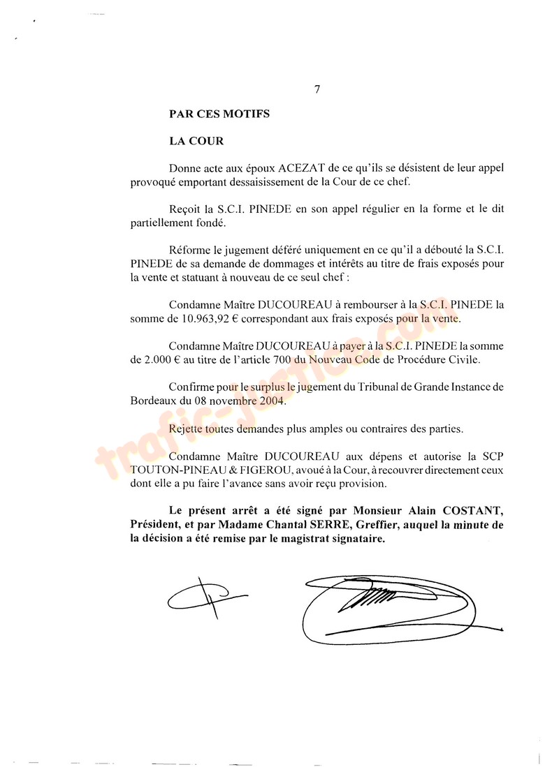 la vente et statuant à nouveau de ce seul chef : Condamne Maître DUCOURAU à rembourser à la S.C.I. PINEDE la somme de 10.963,92 € correspondant aux frais exposés pour la vente. Condamne Maître DUCOURAU à payer à la S.C.l. PINEDE la somme de 2.000 € au titre de l'article 700 du Nouveau Code de Procédure Civile. Confirme pour le surplus le jugement du Tribunal de Grande Instance de Bordeaux du 08 novembre 2004. Rejette toutes demandes plus amples ou contraires des parties. Condamne Maître DUCOURAU aux dépens et autorise la SCP TOUTON-PINEAU & F IGEROU, avoué à la Cour, à recouvrer directement ceux dont elle a pu faire l'avance sans avoir reçu provision. Le présent arrêt a été signé par