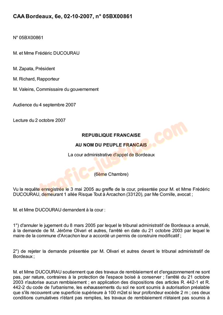M et Mme Frédéric DUCOURAU, à la commune Délibéré après l'audience du 4 septembre 2007 à laquelle siégeaient: M. Zapata, président, |