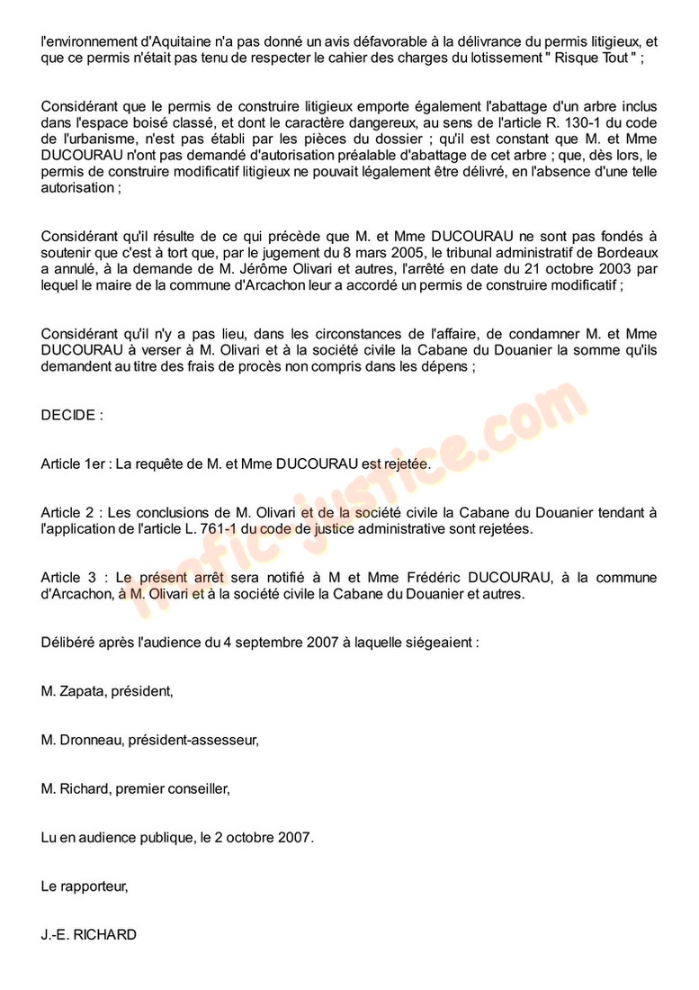 que M. et Mme DUCOURAU ne sont pas fondés à DECIDE : Article 1er: La requête de M. et Mme DUCOURAU est rejetée. Article 2 : Les conclusions de M. Olivari et de la société