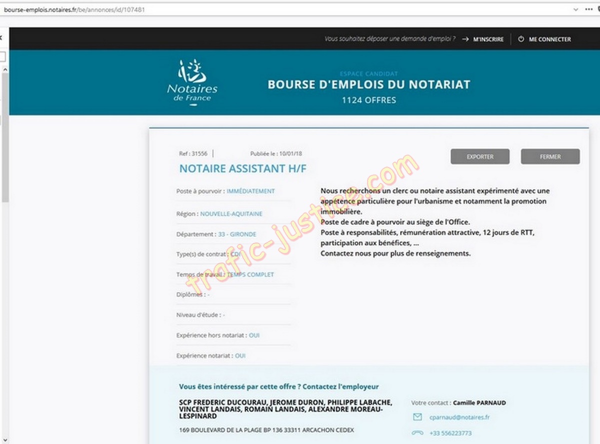 Vous êtes intéressé par cette offre ? Contactez l'employeur SCP FREDERIC DUCOURAU, JEROME DURON, PHILIPPE LABACHE, VINCENT LANDAIS, ROMAIN LANDAIS, ALEXANDRE MOREAU-LESPINARD 169 BOULEVARD DE LA PLAGE BP 136 33311 ARCACHON CEDEX