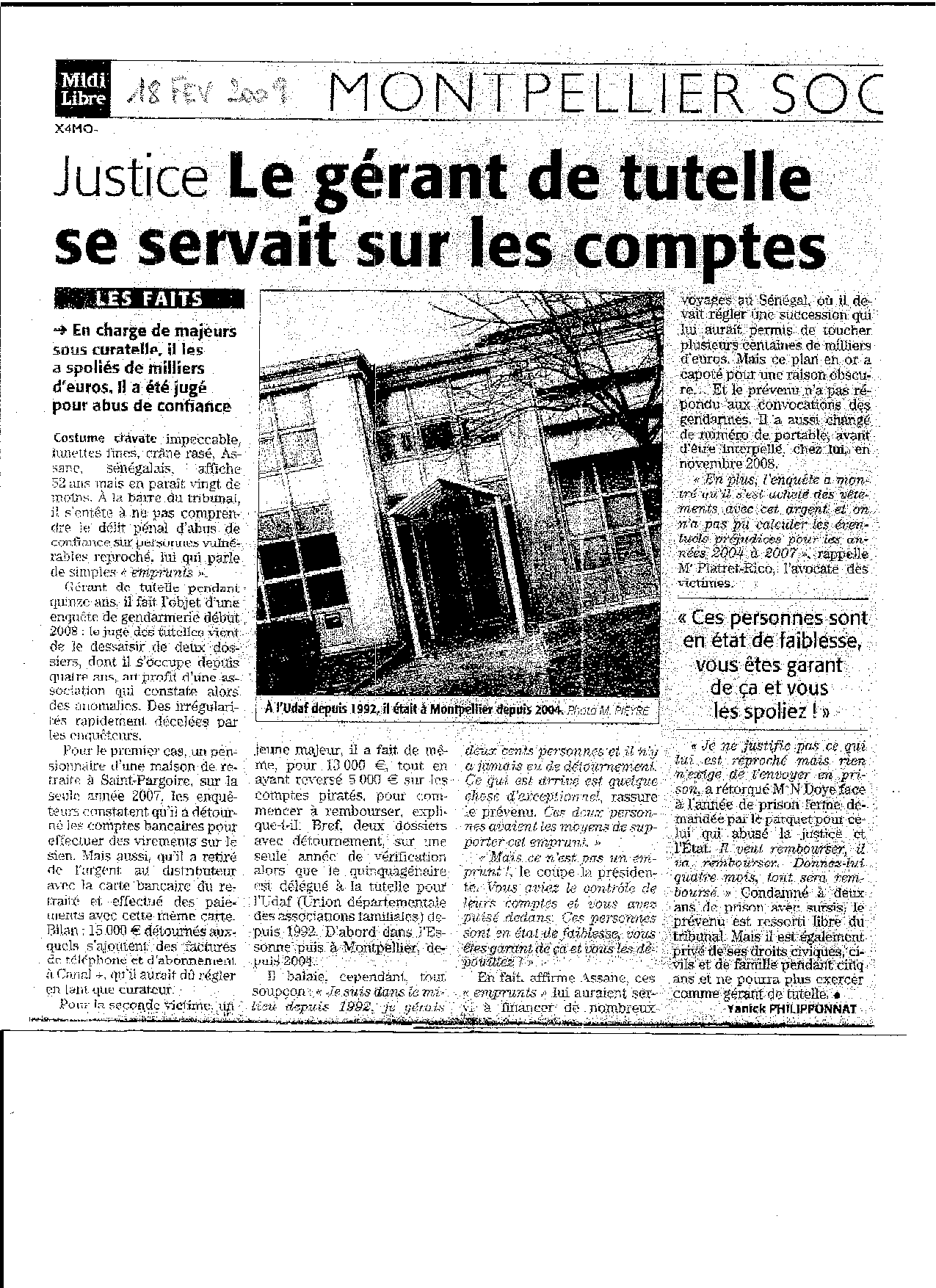 | Publication du Midi Libre du 18/02/09, vous pouvez lire : " Il les a spolié de milliers d'euros, ... 52 ans, ...Assane, sénégalais ... UDAF, Montpellier, ... condamné à deux ans de prison avec sursis le prévenu est resortie libre du tribunal " |