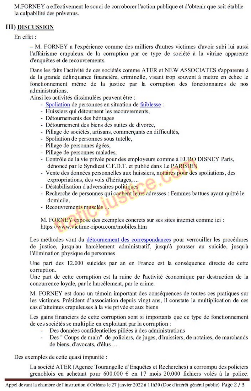 La société ATER (Agence Tourangelle d'Enquêtes et Recherches) a corrompu des policiers grenoblois en achetant pour 600.000 € en 17 mois 20.000 fichiers volés à la police. (Réquisit. pièce 34) Parmi les coupables, un seul a du payer une amende de 17.500 € (3% du butin) et a passé 3 mois en préventive ! ) La seule partie civile victime dans l'affaire, M. FORNEY a été tabassé dans l'enceinte même du tribunal en sortie d'audience par le coupable, ancien commissaire qui a bénéficié de faux flagrants pour sa quasi impunité :