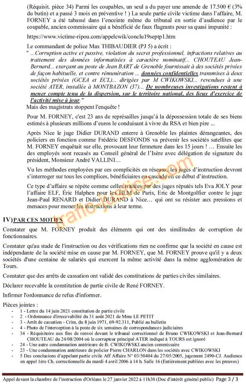 Par une lettre en date du 14 juin 2021 (PJ 1) M. FORNEY s'est constitué partie civile dans une affaire de corruption de cinq fonctionnaires des impôts (n° parquet 21047000142 ; n° inst JI JI2 21000024 ; Id justice 2100507329R).