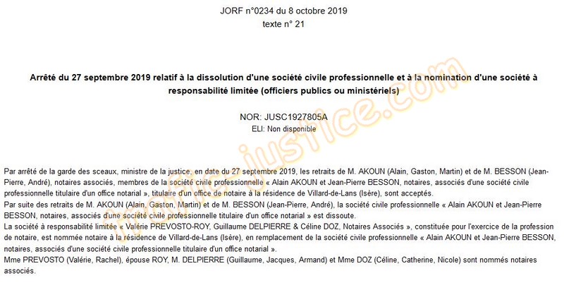 Par arrêté de la garde des sceaux, ministre de la justice, en date du 27 septembre 2019, les retraits de M. AKOUN (Alain, Gaston, Martin) et de M. BESSON (Jean-Pierre, André), notaires associés, membres de la société civile professionnelle « Alain AKOUN et Jean-Pierre BESSON, notaires, associés d'une société civile professionnelle titulaire d'un office notarial », titulaire d'un office de notaire à la résidence de Villard-de-Lans (Isère), sont acceptés. Une audience "assez tard" ! pour éviter le public ? Source : Dauphiné Libéré du 1990 Autre article concernant cet avocat : Voir |