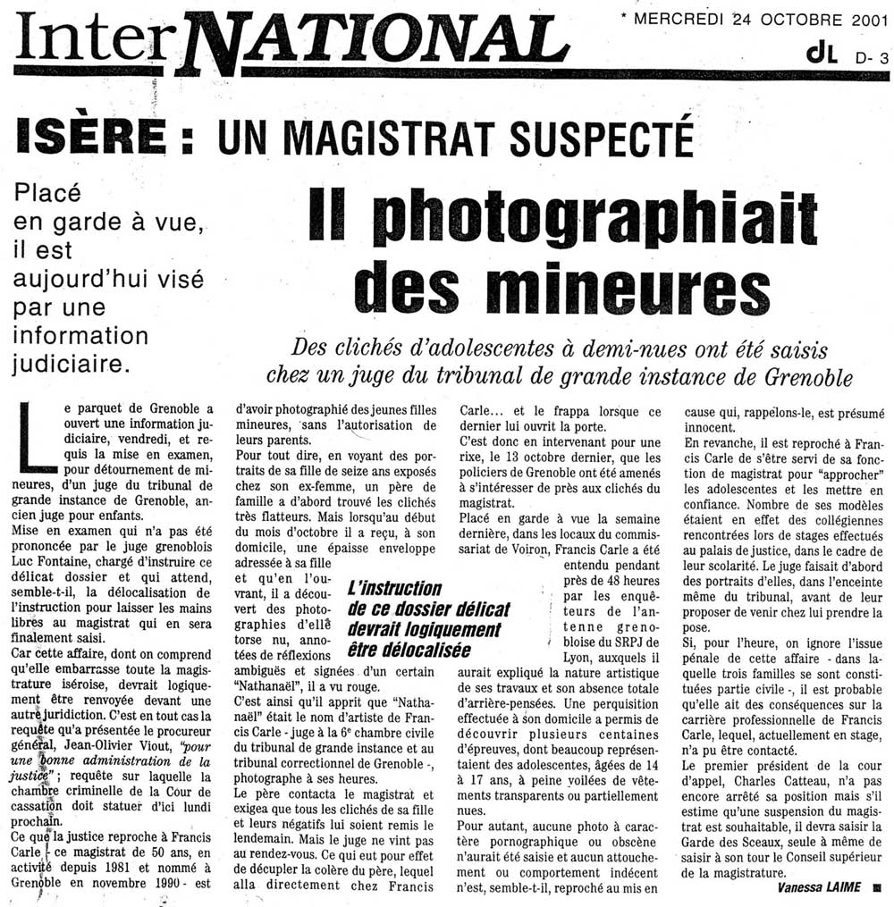 Placé en garde à vue la semaine dernière, dans les locaux du commissariat de Voiron, Francis Carle a été entendu pendant près de 48 heures par les enquêteurs de l'antenne grenobloise du SRPJ de Lyon, auxquels il aurait expliqué la nature artistique de ses travaux et son absence totale d'arrière-pensées. Une perquisition effectuée à son domicile a permis de découvrir plusieurs centaines d'épreuves, dont beaucoup représentaient des adolescentes, âgées de 14 à 17 ans, à peine voilées de vêtements transparents ou partiellement nues.