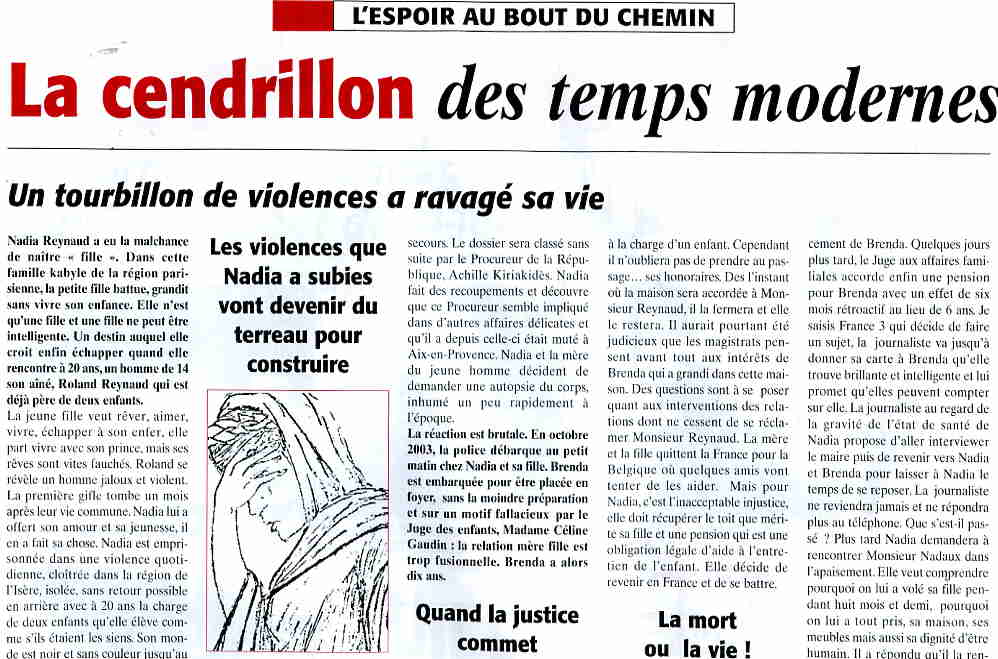 secours. Le dossier sera classé sans suite par le Procureur de la République, Achille Kiriakidès. Nadia fait des recoupements et découvre que ce Procureur semble impliqué dans d'autres affaires délicates et qu'il a depuis celle-ci était muté à Aix-en-Provence. Nadia et la mère du jeune homme décident de demander une autopsie du corps, inhumé un peu rapidement à l'époque. La réaction est brutale. En octobre 2003, la police débarque au petit matin chez Nadia et sa fille. Brenda est embarquée pour être placée en foyer, sans la moindre préparation et sur un motif fallacieux par le Juge des enfants, Madame Céline Gaudin : la relation mère fille est trop fusionnelle. Brenda a alors dix ans. Quand la justice commet l'irréparable ! Nadia et sa fille, SDF, malgré une maison familiale |