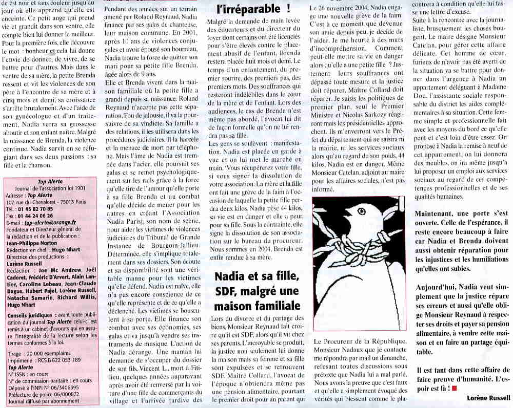 cernent de Brenda. Quelques jours plus tard, le Juge aux affaires familiales accorde enfin une pension pour Brenda avec un effet de six mois rétroactif au lieu de 6 ans. Je saisis France 3 qui décide de faire un sujet, la journaliste va jusqu'à donner sa carte à Brenda qu'elle trouve brillante et intelligente et lui promet qu'elles peuvent compter sur elle. La journaliste au regard de la gravité de l'état de santé de Nadia propose d'aller interviewer le maire puis de revenir vers Nadia et Brenda pour laisser à Nadia le temps de se reposer. La journaliste ne reviendra jamais et ne répondra plus au téléphone. Que s'est-il passé ? Plus tard Nadia demandera à rencontrer Monsieur Nadaux dans l'apaisement. Elle veut comprendre pourquoi on lui a volé sa fille pendant huit mois et demi, pourquoi on lui a tout pris, sa maison, ses meubles mais aussi sa dignité d'être humain. Il a répondu qu'il la rencontrera à condition qu'elle lui fasse une lettre d'excuse.
