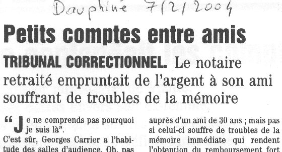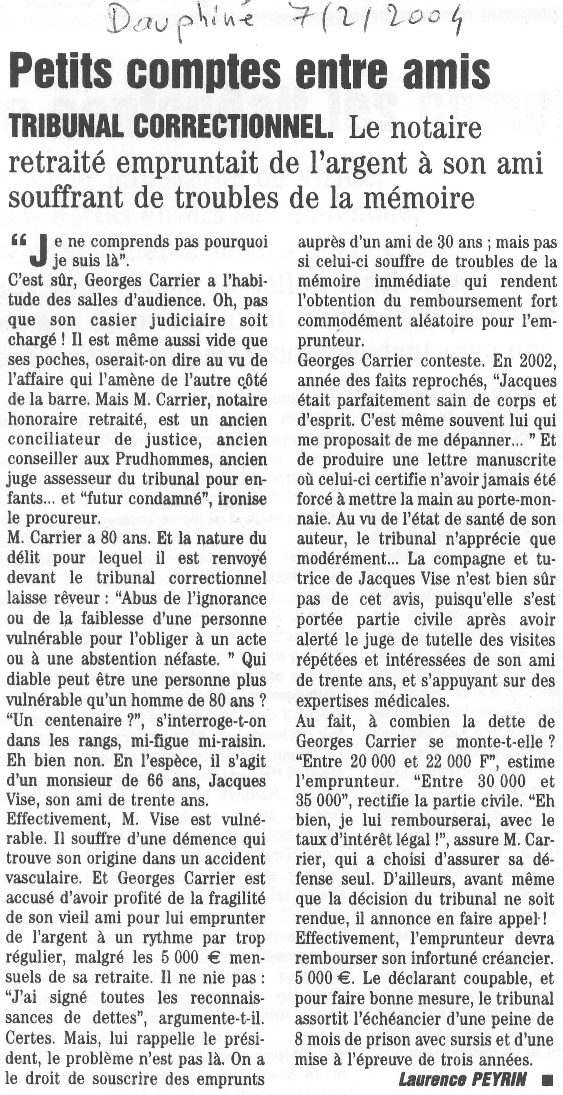 Georges Carrier a l'habitude des salles d'audiences... notaire honoraire retraité, est un ancien conciliateur de justice, ancien conseiller aux Prud'hommes, ancien juge assesseur du tribunal pour enfants... " Abus de l'ignorance ou de la faiblesse d'une personne vulnérable pour l'obliger à un acte ou une abstention néfaste." un monsieur de 66 ans, jacques Vise... souffre d'une démence qui... trouble de la mémoire... En 2002, année des faits reprochés... alerté le juge de tutelle.. à combien la dette de Georges Carrier se monte-t-elle ? "Entre 20 000 et 22 000 F", estime l'emprunteur. "Entre 30 000 et 35 000" rectifie la partie civile...