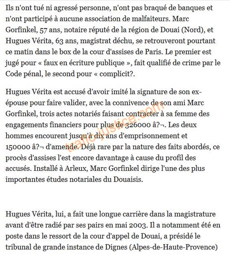 Ils n'ont tué ni agressé personne, n'ont pas braqué de banques et n'ont participé à aucune association de malfaiteurs. Marc Gorfinkel, 57 ans, notaire réputé de la région de Douai (Nord), et Hugues Vérita, 63 ans, magistrat déchu, se retrouveront pourtant ce matin dans le box de la cour d'assises de Paris. Le premier est jugé pour « faux en écriture publique », fait qualifié de crime par le Code pénal, le second pour « complicité.
