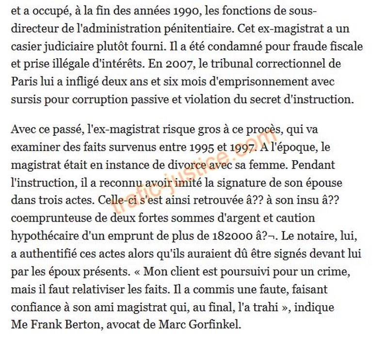 Avec ce passé, l'ex-magistrat risque gros à ce procès, qui va examiner des faits survenus entre 1995 et 1997. A l'époque, le magistrat était en instance de divorce avec sa femme. Pendant l'instruction, il a reconnu avoir imité la signature de son épouse dans trois actes. Celle-ci s'est ainsi retrouvée à son insu a coemprunteuse de deux fortes sommes d'argent et caution hypothécaire d'un emprunt de plus de 182000 euros. Le notaire, lui, a authentifié ces actes alors qu'ils auraient dû être signés devant lui par les époux présents. « Mon client est poursuivi pour un crime, mais il faut relativiser les faits. Il a commis une faute, faisant confiance à son ami magistrat qui, au final, l'a trahi », indique Me Frank Berton, avocat de Marc Gorfinkel.