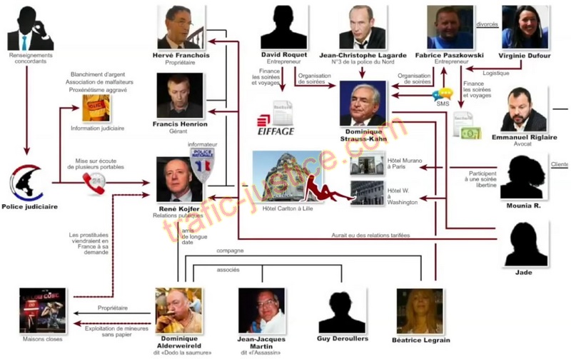 L'IGPN a entendu cinq policiers, dont un commissaire divisionnaire. Au centre de cette affaire, un personnage trouble : René Kojfer, chargé des relations publiques au Carlton. Il a été le premier dirigeant de l'hôtel à avoir été mis en examen pour proxénétisme aggravé en bande organisée. Un choc dans le milieu du luxe et de la nuit dans lequel gravitait depuis trente ans cet ancien marchand de vêtements. Ce personnage réputé proche du monde policier (en clair, un indic) est soupçonné d'avoir recruté des prostituées et de les avoir fournies à un proxénète belge, un certain Dominique Alderweireld, dit Dodo, interpellé et écroué en Belgique. Cet ancien proxénète du nord de la France possède une dizaine d'établissements (bars montants) dans lesquels se prostituent 160 hôtesses venues d'Angola, de Madagascar, du Brésil, de France, d'Algérie et d'Irak. Certaines de ces filles pouvaient participer à des parties fines dans les trois hôtels lillois.