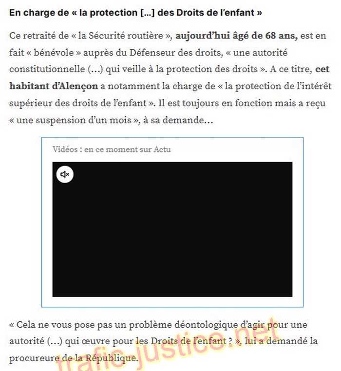Ce retraité de « la Sécurité routière », aujourd'hui âgé de 68 ans, est en fait « bénévole » auprès du Défenseur des droits, « une autorité constitutionnelle (…) qui veille à la protection des droits ». A ce titre, cet habitant d'Alençon a notamment la charge de « la protection de l'intérêt supérieur des droits de l'enfant ». Il est toujours en fonction mais a reçu « une suspension d'un mois », à sa demande…