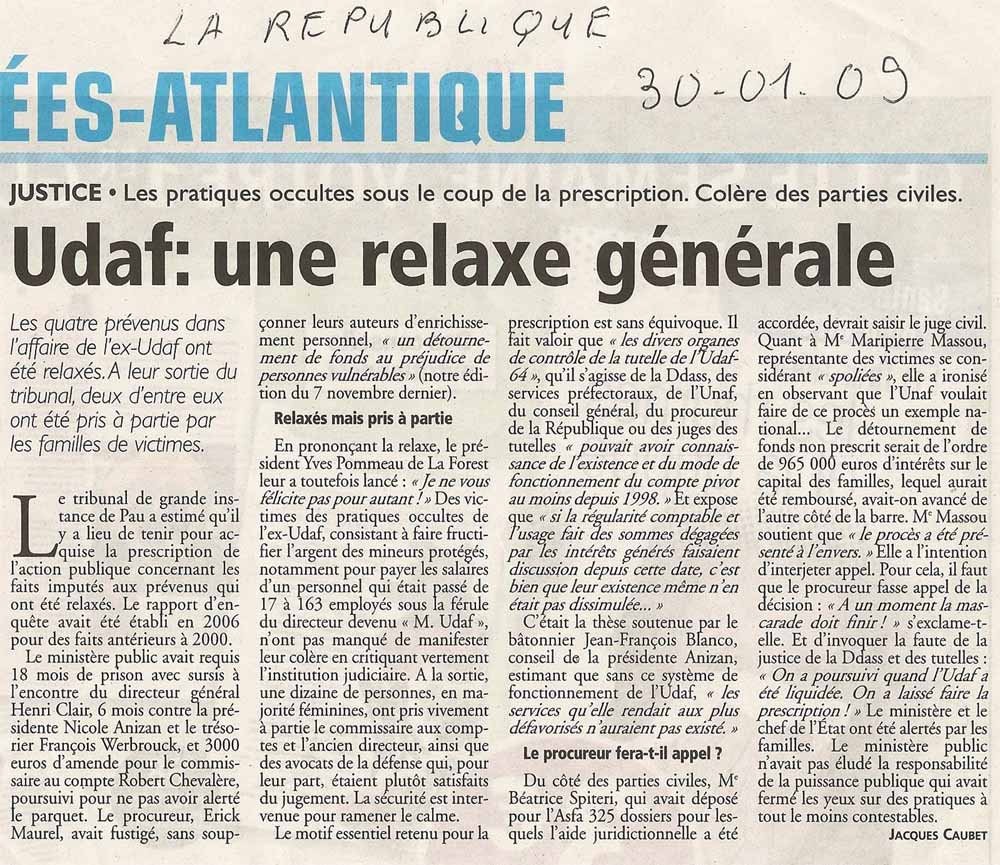 accordée, devrait saisir le juge civil. Quant à Me Maripierre Massou, représentante des victimes se considérant « spoliées », elle a ironisé en observant que l'Unaf voulait faire de ce procès un exemple national... Le détournement de fonds non prescrit serait de l'ordre de 965 000 euros d'intérêts sur le capital des familles, lequel aurait été remboursé, avait-on avancé de l'autre côté de la barre. Me Massou soutient que « le procès a été présenté à l'envers. »Elle a l'intention d'interjeter appel. Pour cela, il faut que le procureur fasse appel de la décision : «A un moment la mascarade doit finir! » s'exclame-t-elle. Et d'invoquer la faute de la justice de la Daass et des tutelles : « On a poursuivi quand l'Udafa été liquidée. On a laissé faire la prescription !» Le ministère et le chef de l'État ont été alertés par les familles. Le ministère public n'avait pas éludé la responsabilité de la puissance publique qui avait ferme les yeux sur des pratiques à tout le moins contestables. JACQUES CAUBET |