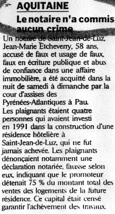 Source AUJOURD'HUI 19 janvier 2004 : " AQUITAINE... Un notaire de Saint-Jean-de- Luz, Jean-Marie Etcheverry, 58 ans, accusé de faux et usage de faux... acquitté... à Pau... investi en 1991... jamais achevé...
