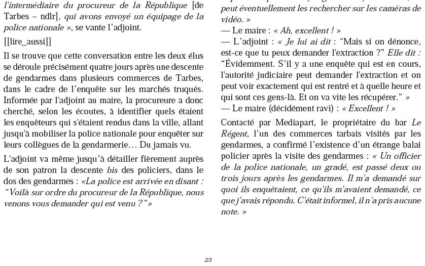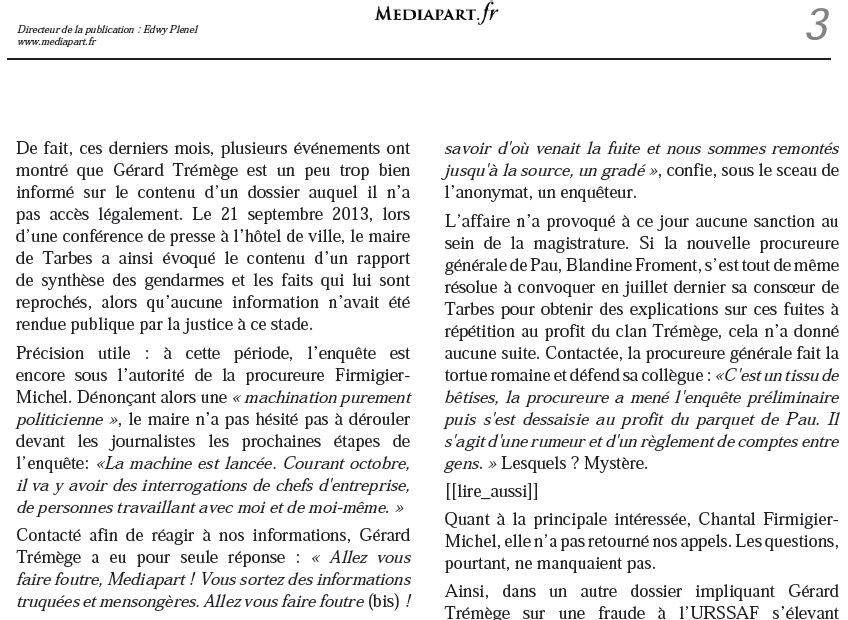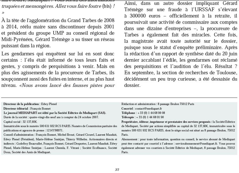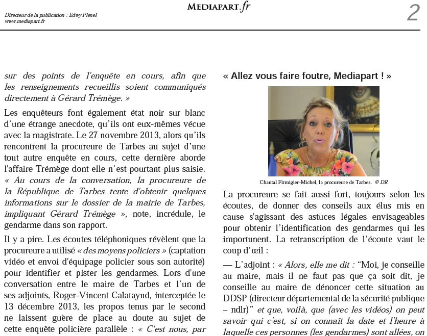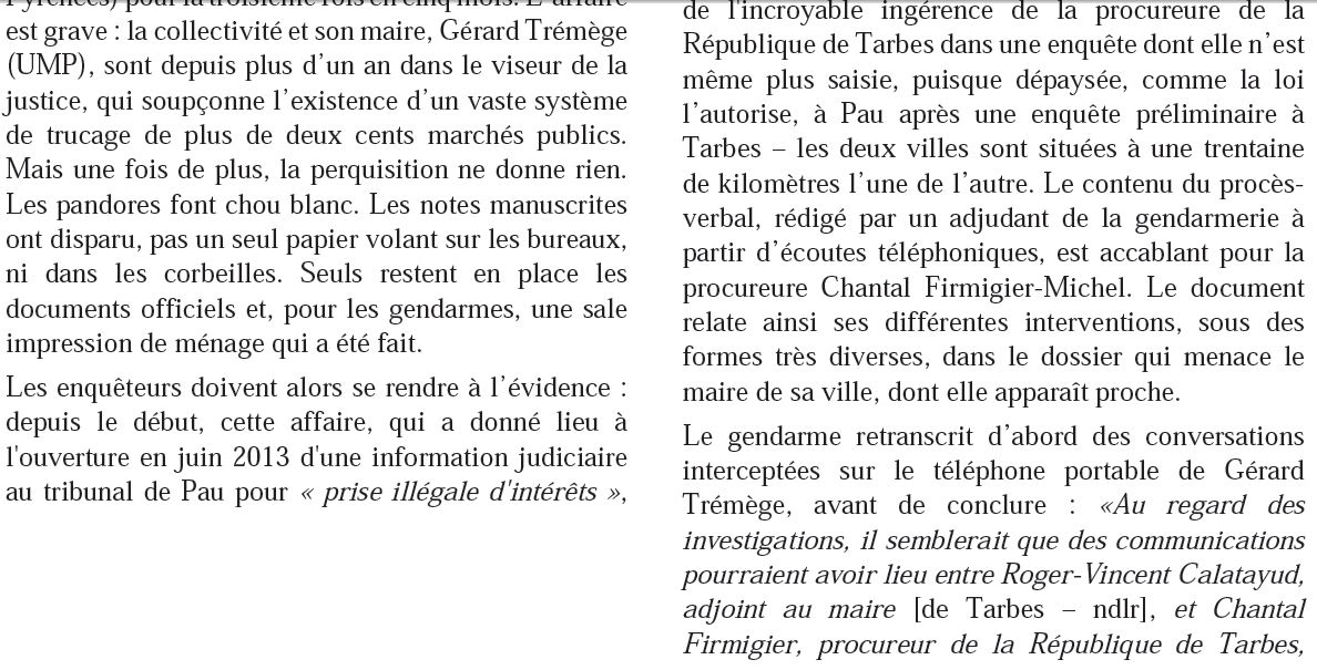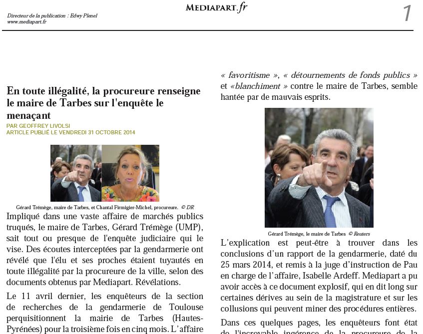 Par Médiapart : Les arrangements d'une procureure et d'un maire UMP 31 OCTOBRE 2014 | PAR GEOFFREY LIVOLSI Impliqué dans une affaire de marchés publics truqués, le maire de Tarbes, Gérard Trémège, sait tout ou presque de l'enquête judiciaire qui le vise. Des écoutes interceptées par la gendarmerie ont révélé que l'élu et ses proches étaient tuyautés par la procureure de la ville. ... Chantal Firmigier-Michel Imprime ici |