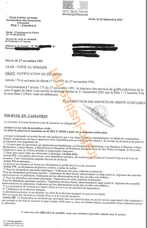 | RÉPUBLIQUE FRANCAISE Référence du dossier N° RG 17/00784 N° Décret du 27 novembre 1991 Mme RENEE DALMASSO … OBJET: NOTIFICATION DE DECISION Article 174 et suivants du décret n° 91-1197 du 27 novembre 1991. Conformément à l'article 177 du 27 no\cmbre 1991. le directeur des services de greffe judiciaires de la cour d'appel de Paris vous notifie la décision rendue le 21 Septembre 2021 par le Pôle I - Chambre 9 de la cour dans l'affaire visée en références. P/LE DIRECTEUR DES SERVICES DE GREFFE JUDICIAIRES, POURVOI EN CASSATION .Article 612 du code de procédure civile : Article 973 : Les parties sont tenues. sauf disposition contraire. de constituer un avocat au Conseil d'Etat et à la Cour de cassation. (Cette constitution emporte élection de domicile. Article 974 et suivants ... Article 975. La déclaration de pourvoi contient, à peine de nullité : Pour les demandeurs personnes morales : l'indication de leurs forme, dénomination et siege social et, s'agissant des autorités administratives ou judiciaire, l'indication de leur dénomination et du lieu où elles sont établies Pour les défendeurs personnes morales : l'indication de leur, forme. dénomination et siège social et. s agissant des autorités administratives ou judiciaires. l'indication de leur dénomination et du lieu où elles sont établies La déclaration précise. le cas échéantt les chefs de la décision auxquels le pourvoi est limité. Article 628 : Le demandeur en cassation qui succombe dans son pourvoi peut. en cas de recours jugé abusif, être condamné à une amende civile dont le montant ne peut excéder 3000 euros et. dans les mémes limites, au paiement d'une indemnité envers le défendeur. si vous avez des difficultés de mobilité, nous vous invitons à prendre attache avec le service CA Adresse postale34, quai des Orfèvres 75055 Paris Cedex 01 |