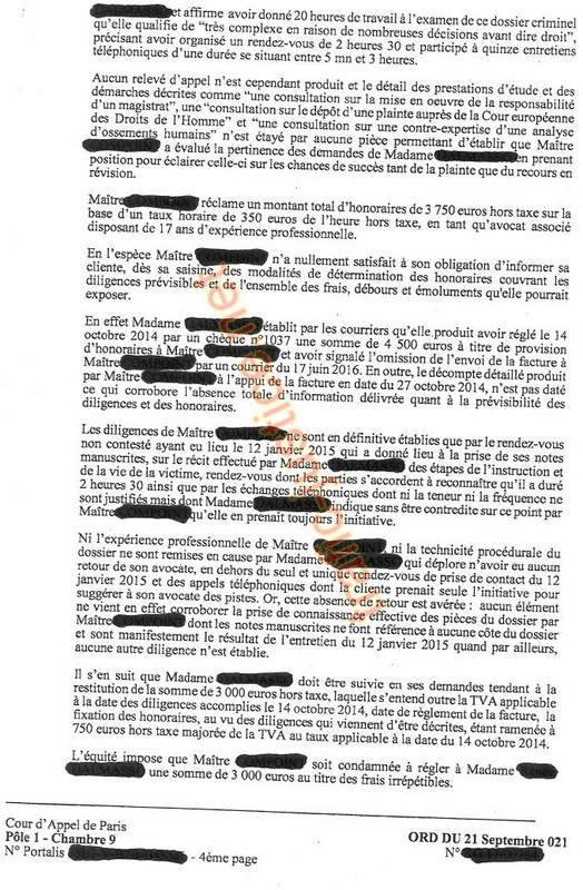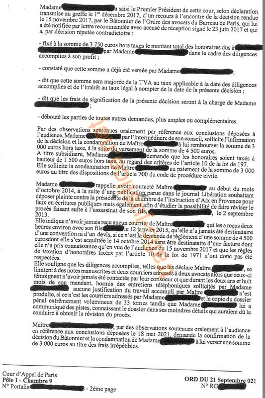 Madame Renée DALMASSO a saisi le Premier Président de cette cour, selon déclaration transmise au greffe le 1er décembre 2017, d'un recours à l'encontre de la décision rendue le 15 novembre 2017, par le Bâtonnier de l'Ordre des avocats du Barreau de Paris, qui lui a été notifiée par lettre recommandée avec accusé de réception signé le 23 juin 2017 et qui a, par décision réputée contradictoire - fixé à la somme tic 3 750 euros hors taxes le montant total des honoraires dus à Madame Anne Laure COMPOINT par Madame Renée DALMASSO dans le cadre des diligences accomplies à son profit ; - constaté que cette somme a déjà été versée par Madame Renée DALMASSO - dit que cette somme sera majorée de la TVA au taux applicable à la date des diligences accomplies et de l'intérêt au taux légal à compter de la date de la présente décision ; - dit que les frais de signification de la présente décision seront à la charge de Madame Renée DALMASSO - débouté les parties de toutes autres demandes, plus amples ou complémentaires. Par des observations soutenues oralement par référence aux conclusions déposées à l'audience, Madame Renée DALMASSO par l'intermediaire de son conseil, sollicite l'infirmation de la décision et la condamnation de Maître COMPOINT à lui rembourser la somme de 3 000 euros hors taxe, à la suite du versement de la somme de 4 500 euros. Madame- DALMASSO rappelle avoir contacté Maître COMPOINT au début du mois d'octobre 2014, à la suite d'une publication parue dans le journal Libération souhaitant déposer plainte contre la présidente de la chambre de l'instruction d'Aix en Provence pour faux en écritures publiques mais également afin d'étudier la possibilité de faire réviser le procès faisant suite à l'assasinat de sont fils Christophe DALMASSO, le 2 septembre 2013. Elle souligne que les diligences accomplies, telles que les déclare Maître COMPOINT, se limitent à des notes manuscrites et deux courriers adressés à deux avocats alors que ceux ci témoignent n'avoir jamais été contactés par leur consoeur, et que durant les deux ans et huit mois de son mandant, hormis des entretiens téléphoniques sollicités par Madame DALMASSO aucune justification du travail accompli Maître COMPOINT n'est produite, si ce n'est les courriers adressés par Madame DALMASSO et la copie du dossier pénal extrêmement volumineux de 33 tomes tandis que Madame DALMASSO lui a communiqué des pistes, connaissant le dossier dans ses moindres détails qui auraient dit la conduire à obtenir la révision du procès. Maîte Anne Laure COMPOINT, par des observations soutenues oralement à l'audience en référence aux conclusions déposées le 18 mai 2021 demande la confirmation de la décision du Bâtonnier et la condamnation de Madame DALMASSO à lui verser une somme de 3 000 euros au titre des frais irrépétibles. Cour d'Appel de Paris ORD DU 21 Septembre 021 |