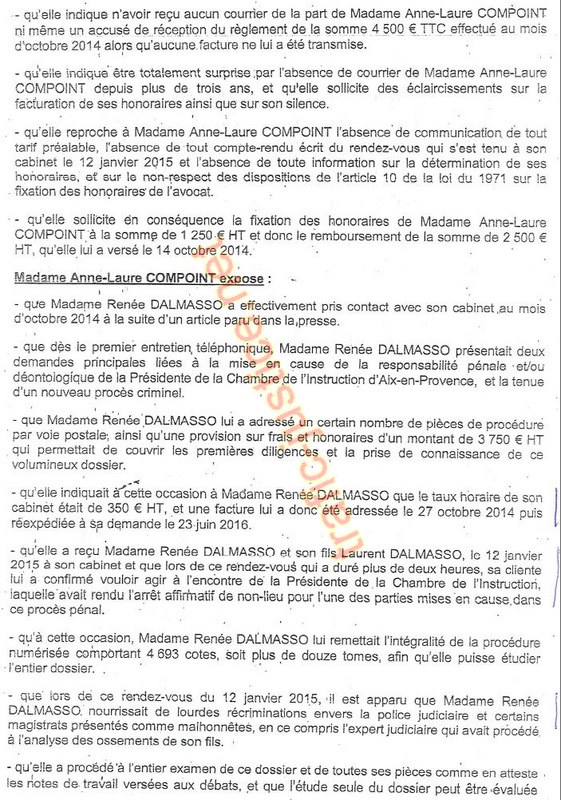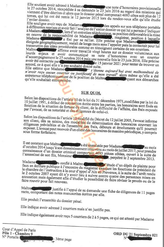 Elle soutient avoir adressé à Madame-DALMASSO une note d'honoraires provisionnelle le 27 octobre 2014, réexpédiée à sa demande le 23 juin 2016 au regard des missions qui viennent d'être décrites et alors que le dossier pénal comprenait 4693 côtes soit plus de 12 tomes, qui lui ont été remis le 12 janvier 2015 lors du rendez-vous afin qu'elle étudie l'entier dossier. Elle souligne ,voir reçu de Madame DALMASSO des appels sur son téléphone portable à différentes reprises et avoir fait l'analyse de l'entier dossier ce qui lui a permis d'indiquer à Madame DALMASSO lors d'un entretien téléphonigue sa position défavorable â la mise en oeuvre de la responsabilité de Madame BERNARE, magistrat, position à laquelle Madame DALMASSO a fini par se rallier. Elle précise que Madame DALMASSO éloignée géographiquement, restait de longs mois sans l'appeler puis la contactait pour lui transmettre des idées procédurales comme en témoignent certains de ses courriers. Maître COMPOINT affirme avoir travaillée vingt heures sur ce dossier volumineux aux lourds enjeux et avoir communiqué sa note d'honoraires avec un courrier d'accompagnement le 27 octobre 2014 puis une nouvelle fois le 23 juin 2016. Elle précise avoir été contactée par Laurent DALMASSO le 15 janvier 2021 pour tenter de trouver un accord, ce à quoi elle n'a pas souhaité donner suite. SUR QUO1, Selon les dispositions de l'article 10 de la loi du 31 décembre 1971, modifiées par la loi du 10 juillet 1991, à défaut de convention écrite entre les parties, les honoraires sont fixés en fonction de la situation de fortune du client, de la difficulté de l'affaire, des frais exposés par l'avocat, de sa notoriété et des diligences de celui-ci. Selon les dispositions de l'article 10 modifié du Décret du 12 juillet 2005, l'avocat informe son client, dès sa saisine, des modalités de détermination des honoraires couvrant les diligences prévisibles et de l'ensemble des frais, débours et émoluments qu'il pourrait exposer. L'avocat peut recevoir d'un client des honoraires de manière périodique, y compris sous forme forfaitaire. Il est constant que Maitre COMPOINT été mandatée par Madame DALMASSO au mois d'octobre 2014 jusqu'à son dcssaisisement intervenu aumois de juillet 2017, pour prendre connaissance d'un dossier criminel comportant 4693 idées côtées, ouvert à la suite de l'assassinat de son fils, Monsieur Christian DALMASSO, perpétré le 2 septembre 2013. Madame DALMASSO a confié à Maître COMPOINT l'étude d'un dépôt de plainte pour faux en écriture publique à l'encontre du magistrat exerçant les fonctions de président de la chambre de l'instruction à la cour d'appel d'Aix en Provence, à la suite de l'arrêt rendu le 2 octobre 2007 ayant dit n'y avoir lieu à suivre contre quatre des personnes mises en accusation mais également afin d'étudier la possibilité de faire réviser le procès ou de le faire rouvrir pour fait nouveau. Maître COMPOINT justifie à l'appui de sa demande une fiche de diligences de 11 pages recto, comportant des notes manuscrites écrites par elle. Elle produit !'ensemble du dossier pénal. Elle indique avoir adressé 2 courriers mais n'en justifie pas. Elle indique également avoir reçu 5 courriers de 2 à 5 pages, ce qui est attesté par Madame Cour d'Appel de Paris ORD du 21Septembre 021 |