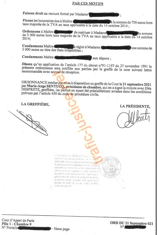 PAR CES MOTIFS Faisons droit au recours formé par Madame DALMASSO Fixons les honoraires dus à Maître COMPOINT à la somme de 750 euros hors taxe majorée de la TVA au taux applicable à la date du 14 octobre 2014; Ordonnons à Maître COMPOINT de restituer à Madame René DALMASSO Ia somme de 3 000 euros hors taxe majorée de la TVA au taux applicable à la date du 14 octobre 2014; Condamnons Maître COMPOINT à régler à Madame Renée DALMASSO une somme de 3000 euros au titre des frais irrépétitibles ; Condamnons Maître Anne-Laure COMPOINT aux dépens ; Disons qu'en application de l'article 177 du décret n°91-1197 du 27 novembre 1991 la présente ordonnance sera notifiée aux parties par le greffe de la cour suivant lettre recommandée avec accusé de réception. ORDONNANCE rendue par mise à disposition au greffe de la Cour le 21 septembre 2021 par Marie-Ange SENTUCQ, présidente de chambre, qui en a signé la minute avec Eléa DESPRETZ, greffière, les parties en ayant été préalablement avisées dans les conditions prévues par l'article 450 du code de procédure civile. LA GREFFIÈRE, LA PRÉSIDENTE, Cour d'Appel de Paris ORD du 21Septembre 021 |