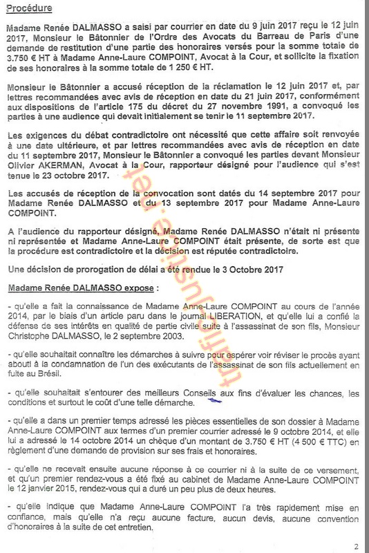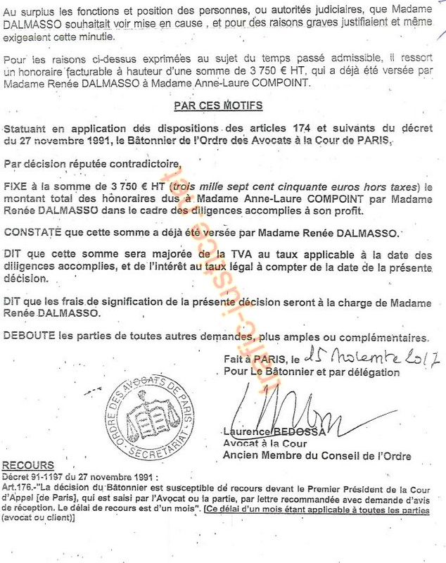 RÉPUBLIQUE FRANÇAISE AU NOM DU PEUPLE FRANÇAIS COUR D'APPEL DE PARIS ORDONNANCE DU 21 SEPTEMBRE 2021 Numéro d'inscription au répertoire général N° RG 17/00784 - N° Portalis 35L7-V-B7B-B4SM L NOUS, Maric-Ange SETUCQ, Présidente de chambre à la Cour d'Appel de PARIS, agissant par délégation de Monsieur le Premier Président de cette Cour, assistée de Eléa DESPRETZ, Grcffière lors des débats et lors de la mise à disposition de l'ordonnance. Vu le recours formé par : Madame René DALMASSO Représentée par Me Alain ABITAN avocat au barreau de PARIS, toque : B0630 Demandeur au recours. contre une décision du Bâtonnier de l'ordre des avocats de PARIS dans un litige l'opposant à : Maitre Anne Laure COMPOINT Comparante en personne, Défendeur au recours. Par décision contradictoire, statuant par mise à disposition au greffe, après avoir entendu les parties présentes à notre audience du 18 Mai 2021 et pris connaissance des pièces déposées au Greffe, L'affaire a été mise en délibéré au 21 Septembre 2021 ***** |