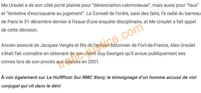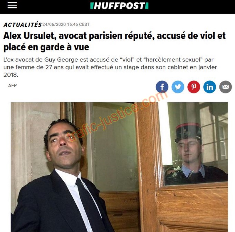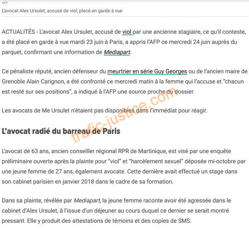 | Ce signalements permettra t-il de trouver des antécédants similaires ? Voir recopie ci-dessous Une figure du barreau de Paris radié ACTUALITÉS 24/06/2020 16:46 CEST Alex Ursulet, avocat parisien réputé, accusé de viol et placé en garde à vue L'ex avocat de Guy George est accusé de “viol” et “harcèlement sexuel” par une femme de 27 ans qui avait effectué un stage dans son cabinet en janvier 2018. AFP