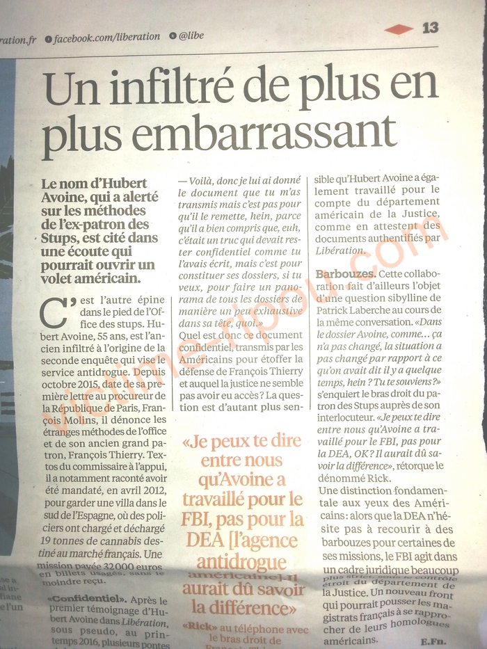 Barbouzes. Cette collaboration fait d'ailleurs l'objet d'une question sibylline de Patrick Laberche ait cours de la même conversation. « Dans le dossier Avoine, comme... ça n'a pas changé, la situation a pas changé par rapport à ce qu'on avait dit il y a quelque temps, hein ? Tu te souviens ? » s'enquiert le bras droit du patron des Stups auprès de son interlocuteur. « Je peux te dire entre nous qu'Avoine a travaillé pour le FBI, pas pour la DEA, OK ? II aurait dû savoir la différence», rétorque le dénommé Rick.