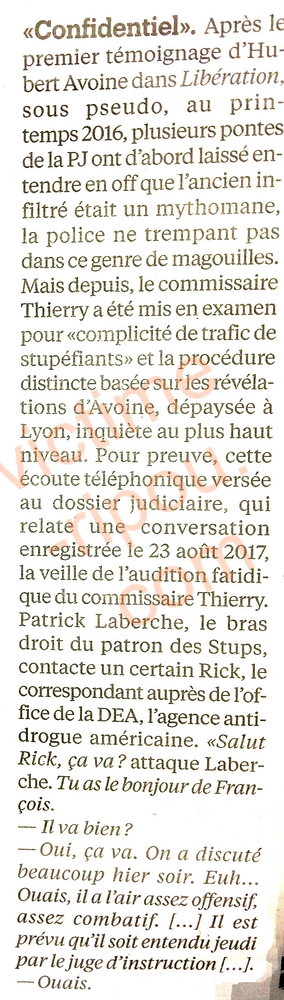 Mais depuis, le commissaire Thierry a été mis en examen pour « complicité de trafic de stupéfiants » et la procédure distincte basée sur les révélations d'Avoine, dépaysée à Lyon, inquiète au plus haut niveau, Pour preuve, cette écoute téléphonique versée au dossier Judiciaire, qui relate une conversation enregistrée le 23 août 2017, la veille de l'audition fatidique du commissaire Thierry. Patrick Laberche, le bras droit du patron des Stups, contacte un certain Rick, le correspondant auprès de l'office de la DEA,1'agence antidrogue américaine. « Salut Rick, ça va ? attaque Laberche. Tu as le bonjour de François.
